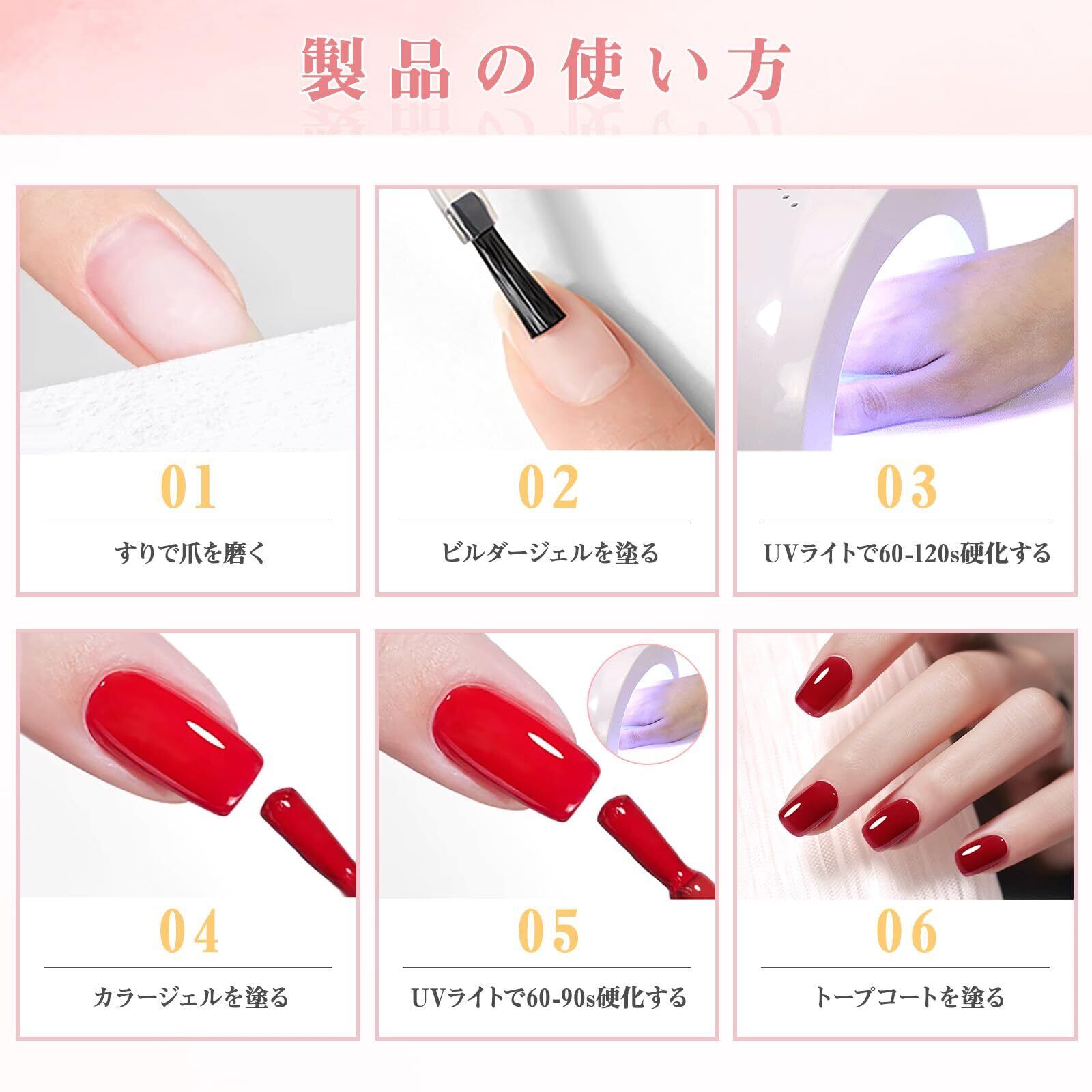 【ネイルを保護】ビルダーネイルジェルを塗ると、爪の表面にしっかりとした強力な保護層が形成され、28日ほど爪を保護できます。ビルダーネイルジェルで形成された保護層の上に、U Vジェルポリッシュ、ネイルジェル、ジェルペイント、ディップパウダーなどのネイル製品を引き続き塗布して、より魅力的にすることができます。