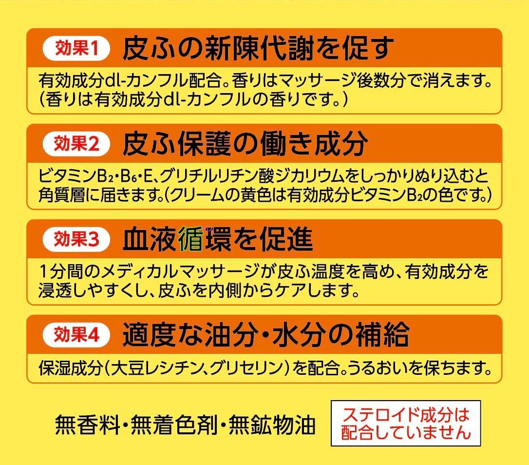●香りが消えるまでしっかりぬりこむ、ちょっと手ごわい肌荒れに1分間のメディカルマッサージ ●マッサージ効果で薬用成分が角質層まで届き、しっとりうるおった肌に導きます。 ●皮膚の保護成分ビタミンB2・B6・Eおよびグリチルリチン酸ジカリウム、保湿成分大豆レシチン、血行を促進する成分dL-カンフルが含まれている親水性のクリーム。 ●皮膚に塗布したあとマッサージをしながらよくスリ込んでください。顔にもご使用いただけます。 ●無香料・無着色剤・無鉱物油 ●ステロイド成分は配合していません 効果①皮膚の新陳代謝を促します 有効成分dL-カンフルを配合。香りはマッサージ後数分で消えます。(有効成分dL-カンフルの香りです) 効果②皮膚保護の働き成分配合 ビタミンB2・B6・E、グリチルリチン酸ジカリウムをしっかりぬり込むことで角質層に届きます。(クリームの黄色は有効成分ビタミンB2の色です。) 効果③血液循環を促進 1分間のマッサージが皮膚温度を高め、有効成分を浸透しやすくし、皮膚を内側からケアします。 効果④適度な油分・水分の補給 保湿成分(大豆レシチン・グリセリン)を配合。うるおいを保ちます。