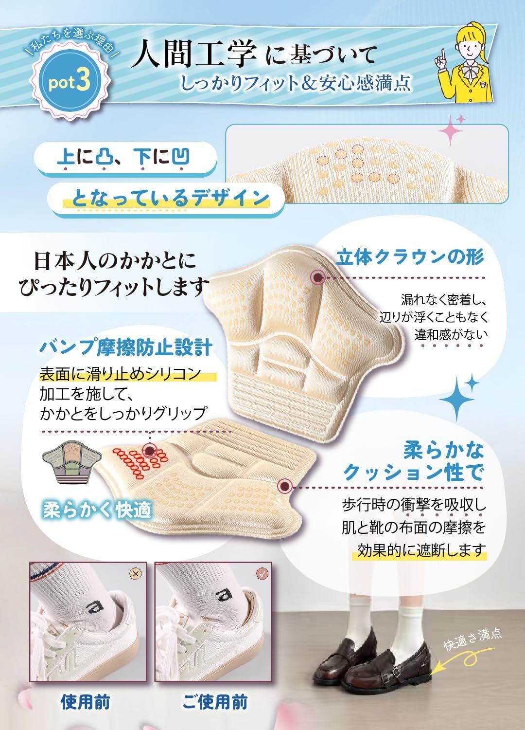 【3D 構造&滑り止めシリコン】かかとを広範囲に包むようにカバーできる 3D 構造で、靴かかとパカパカ防止・かかと くつずれ防止の効果を発揮します。肌に優しいシリコン素材の滑り止め付きで、靴擦れや靴が大きすぎる場合でも安心してお使いいただけます。さらに、非常に軽量で長時間装着していても違和感ゼロ。また、ムレにくい通気性の良い素材を採用しているため、快適な着用感が持続します。