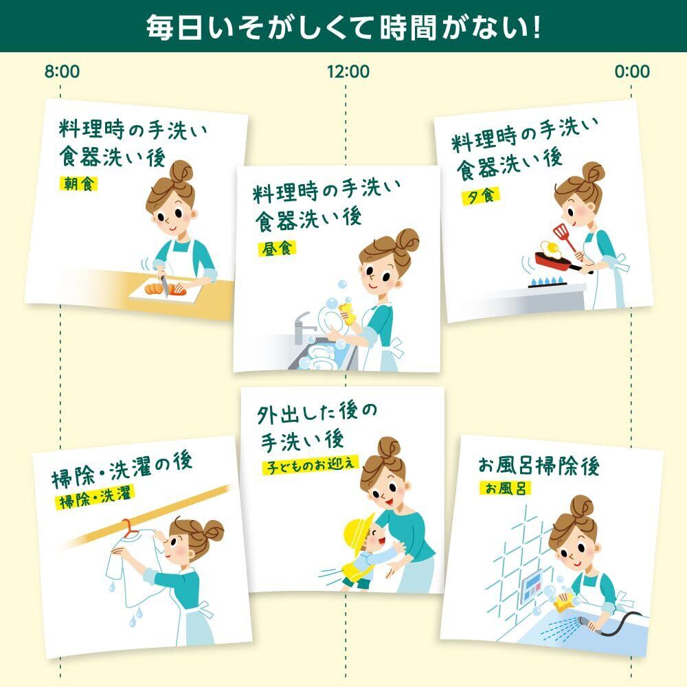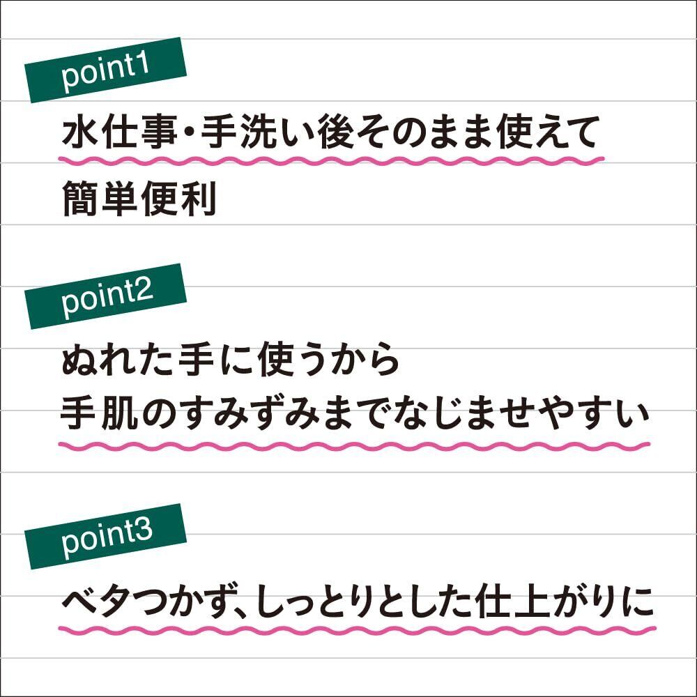 食器洗い後、手洗い後、ぬれた手に使ってサッと流す手軽なハンドケア習慣。ぬれたままの手にワンプッシュし、手肌になじませた後、水で流すとうるおいのベールが手肌のすみずみまで包み込み、ベタつかずしっとりとした仕上がりに。 ●うるおい成分:カモミールエキス(カミツレ花エキス)・ワセリン配合 ●無香料