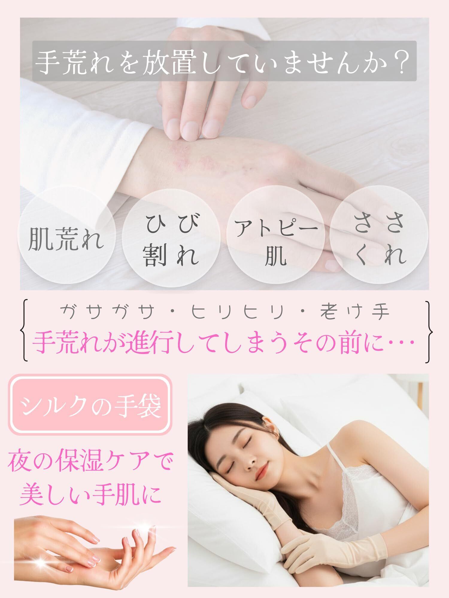 【美容看護師監修|シルク100%ナイト手袋】手荒れ・乾燥に悩む方のために、美容看護師が監修した就寝用 シルク 手袋。保湿力・通気性・肌へのやさしさにこだわり、睡眠中の手肌を快適にケアするナイトグローブです。※フィット感を高めるため、手首部分のみ5~7%程度のポリウレタンを使用しています。