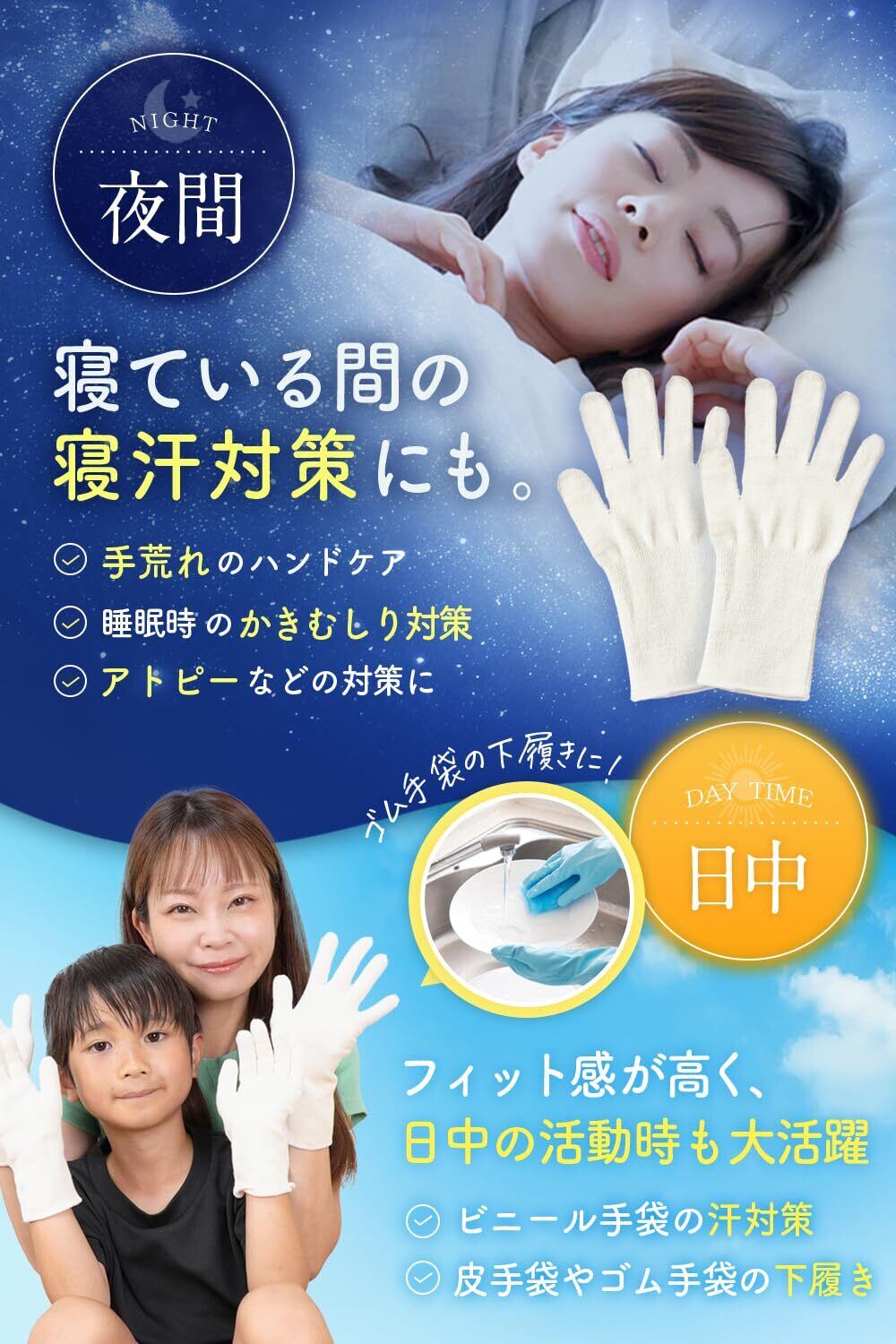 【24時間ケアする】日中も夜も、手肌をいたわる!日中は家事や仕事中のゴム手袋、皮手袋のインナーとして。気になるニオイをシャットアウトし、手荒れを予防します。夜はハンドクリーム後の保湿手袋として。潤いを閉じ込め、翌朝しっとり、見違えるような手肌へ。 日中の作業による摩擦刺激からも守り、手荒れの原因となる外的刺激を軽減します。
