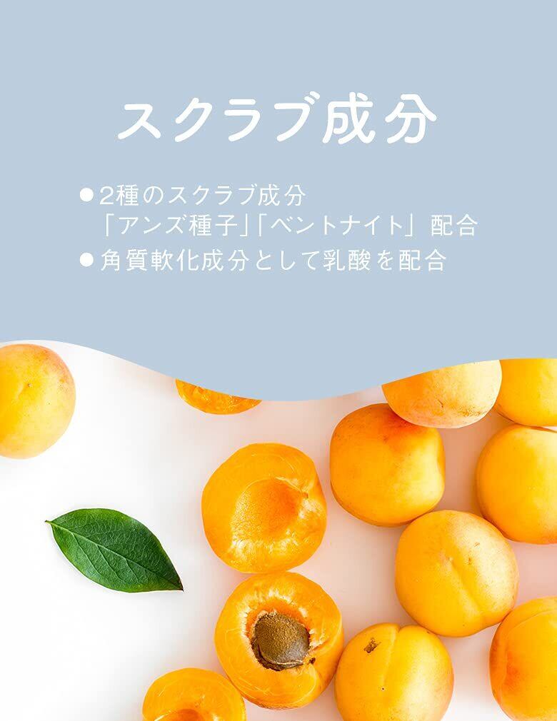 2種のスクラブ成分「アンズ種子」「ベントナイト」配合。角質軟化成分の乳酸配合で角質をしっかりケアします