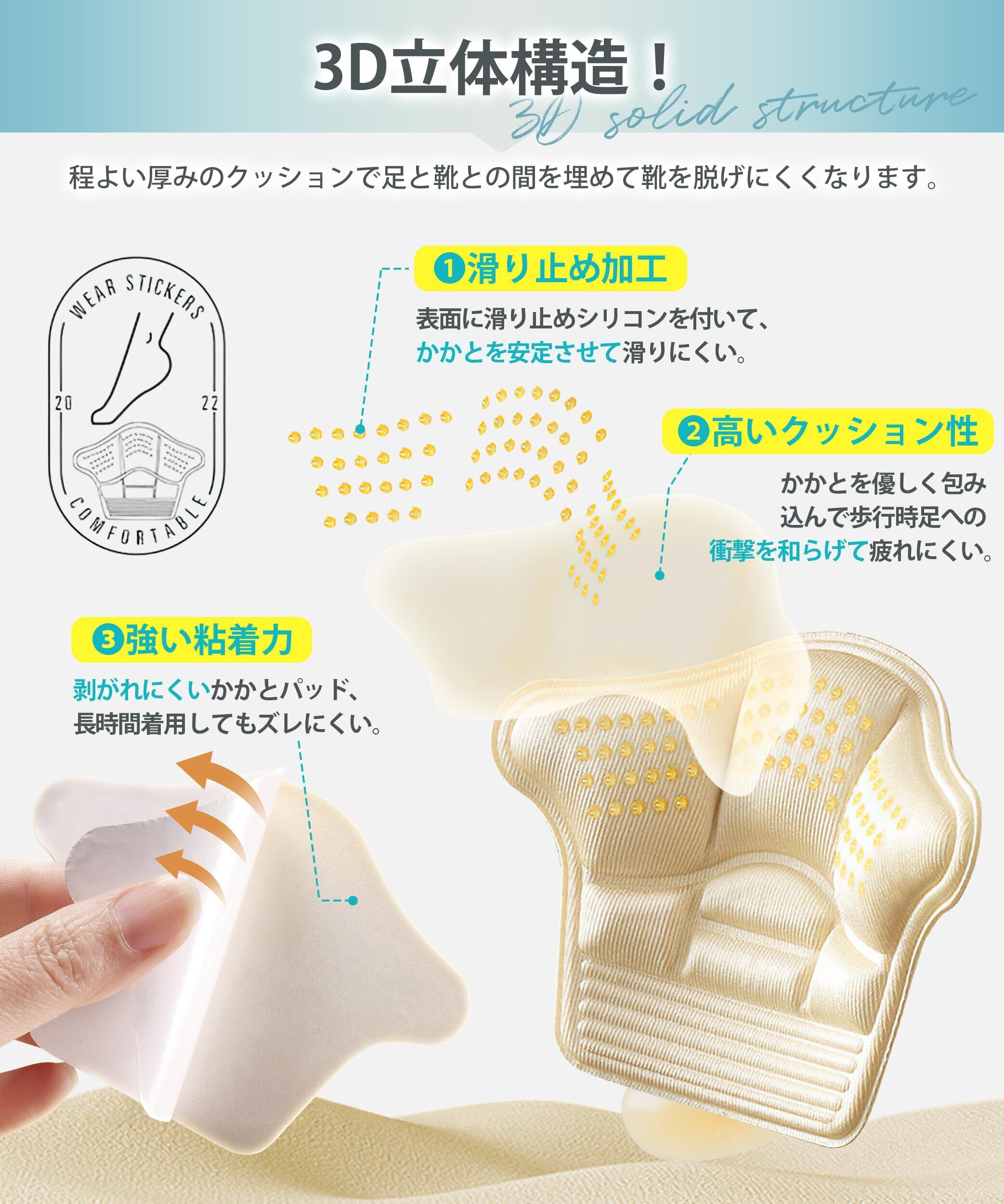 【靴擦れ防止】靴の悩みを解決する理学療法士が監修した靴擦れ防止かかとパッド。上に凸、下に凹となっているデザイン、日本人のかかとにぴったりフィットします。かかとの形状によって設計された3D構造のかかとパッド。かかとをしっかり固定でき、良い姿勢をサポートします。靴の隙間をなくすことができ、かかとと靴との摩擦をまぬがれます。柔らかな履き心地を感じられるかかと クッション、靴擦れ防止に最適。