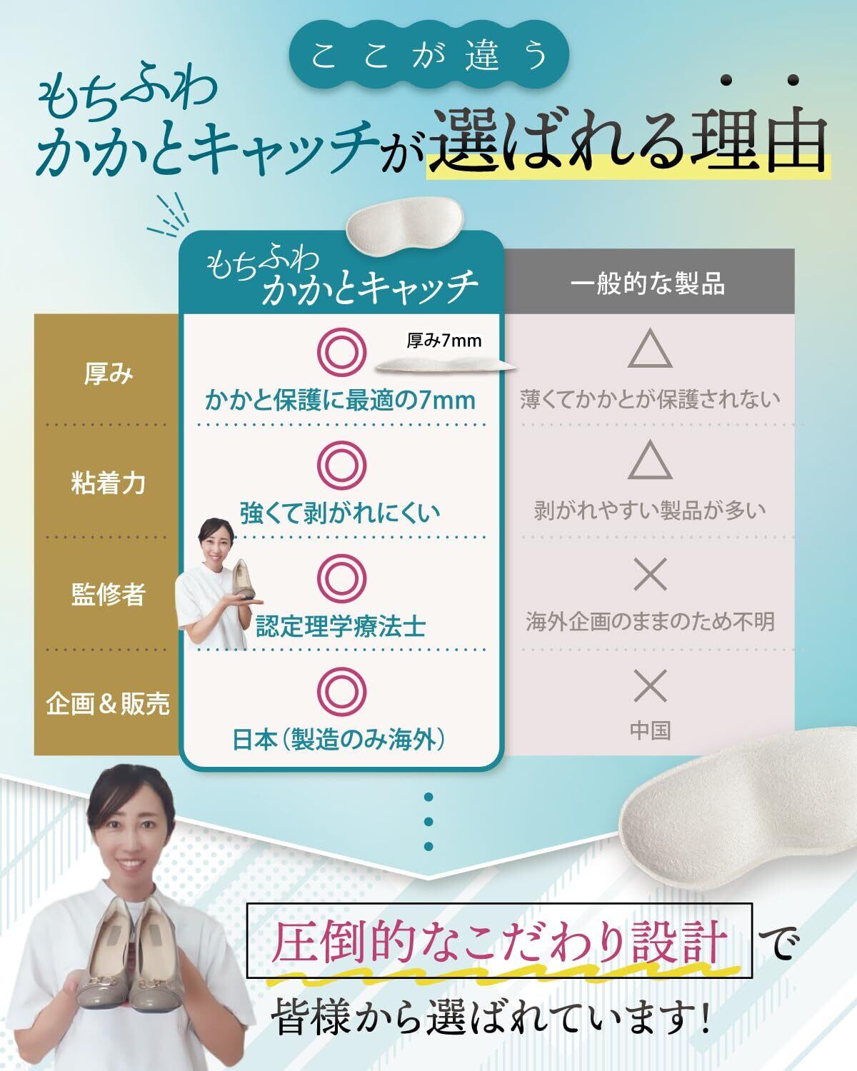 【もちふわ かかとキャッチ】は、ズレにくく、しっかりフィットし、着脱も簡単。かかとのフィット感が各段にアップ。姿勢が整い歩き方もラクに、長時間履いても疲れにくい、足ズレ防止で靴の中が安定、クッション性でかかとを優しくサポート
