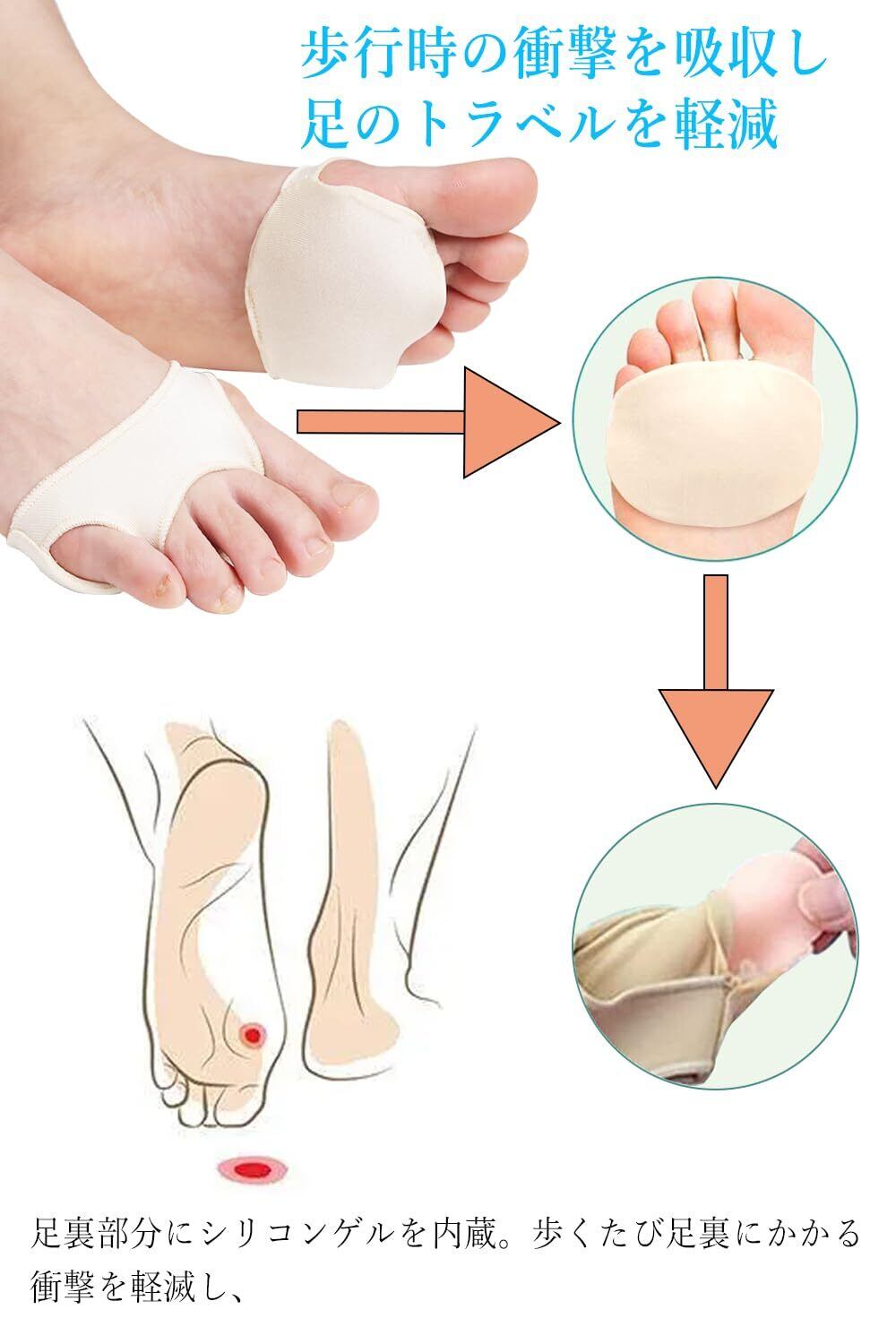 【適応対象】底まめ、タコ、ウオノメなどができて痛い時に、足裏保護パッド(特殊ジェル)が足裏のつけ根部分のかたくなった部分や痛い部分にフィットし、パンプスやヒールからくるズキズキにお困りの方におすすめ!
