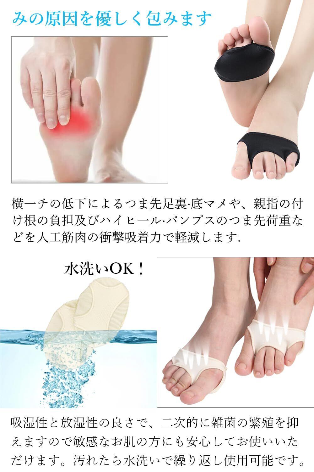 【足裏の痛みを和らげる】 高品質な医療用シリコンジェルと高級な布地素材の足裏保護パッド、非常にやわらかく、肌に優しく、衝撃を効果的に吸収できる。さらに、魚の目、タコ、マメ、足底筋膜炎、水虫等の症状から足裏を保護し、痛みを軽減し、快適な歩行を実現します。 【抜群のフィット感】 足裏にぴったりとフィットする設計になっており、靴下やストッキングを履いてもフィットします。ハイヒールや、スニーカー、ブーツ、サンダル等全ての履物に対応。運動・ジョギング・立ち仕事・ハイヒール・作業用靴など様々なシーンで使えます。 【シリコン製で伸縮性があり】 柔らかくて変形しにくいシリコンを採用し、足指に快適にフィットし、足指間に摩擦を大幅に軽減、足指と足裏を保護します。柔らかいシリコンで足指サポーターは伸縮性に優れ、男女兼用の足指セラピーです。 通気性や湿気吸収なども優れ、長時間の装着でも疲れないし付け心地も良く、実用性にはご満足いただけます。 【繰り返し使う】 衛生のために、使用後、毎回洗うことをお勧めします。繰り返し使えて経済的です。 【適応対象】底まめ、タコ、ウオノメなどができて痛い時に、足裏保護パッド(特殊ジェル)が足裏のつけ根部分のかたくなった部分や痛い部分にフィットし、パンプスやヒールからくるズキズキにお困りの方におすすめ!