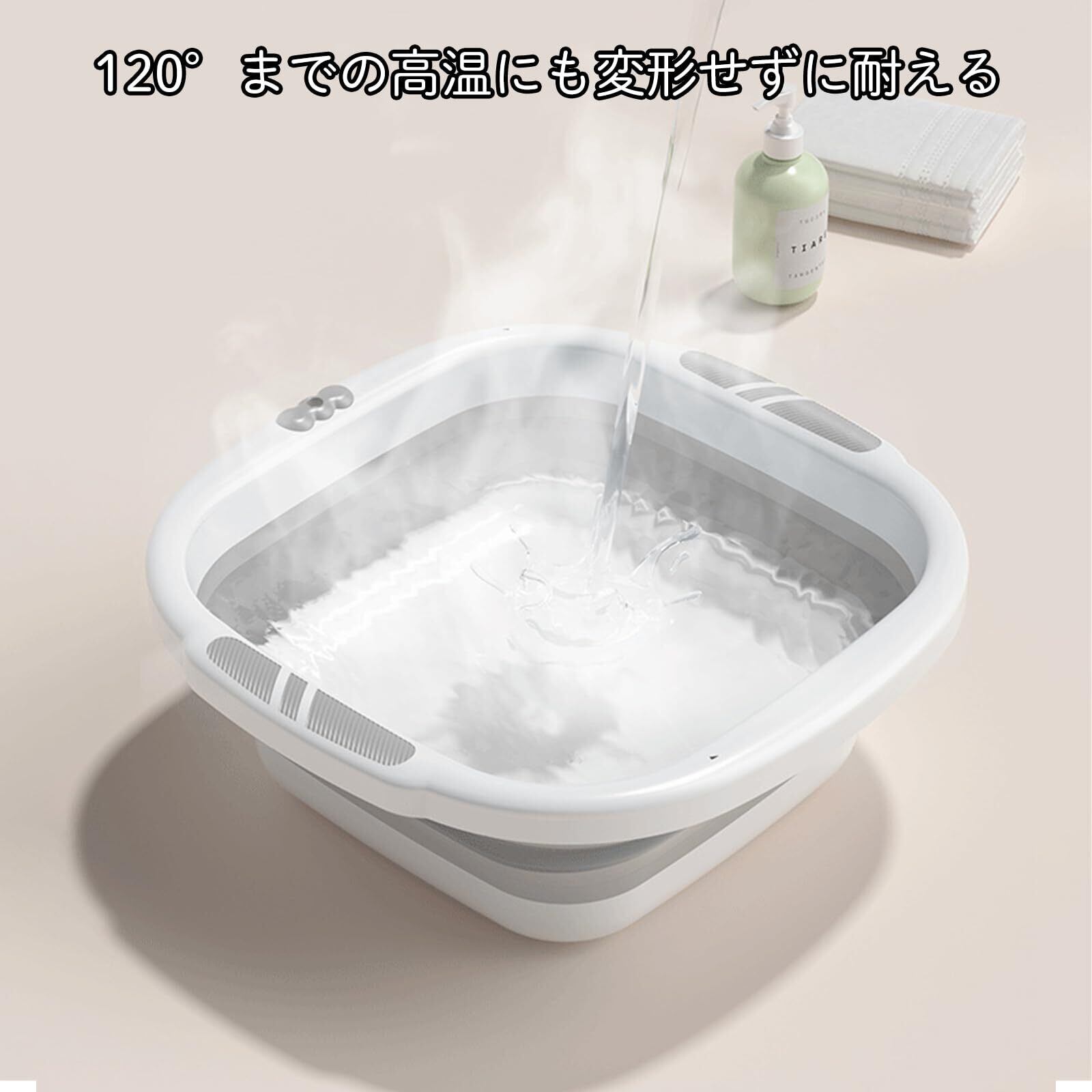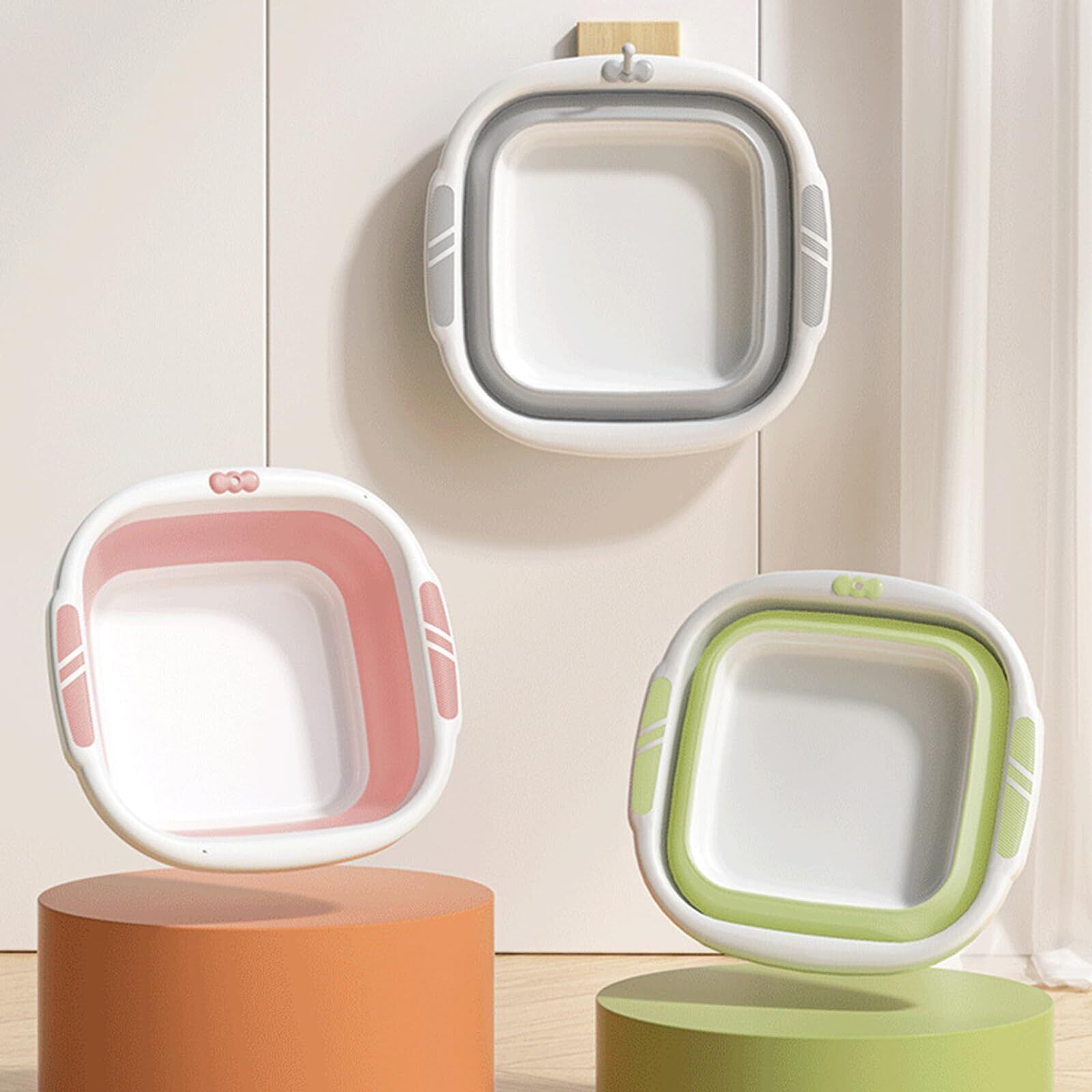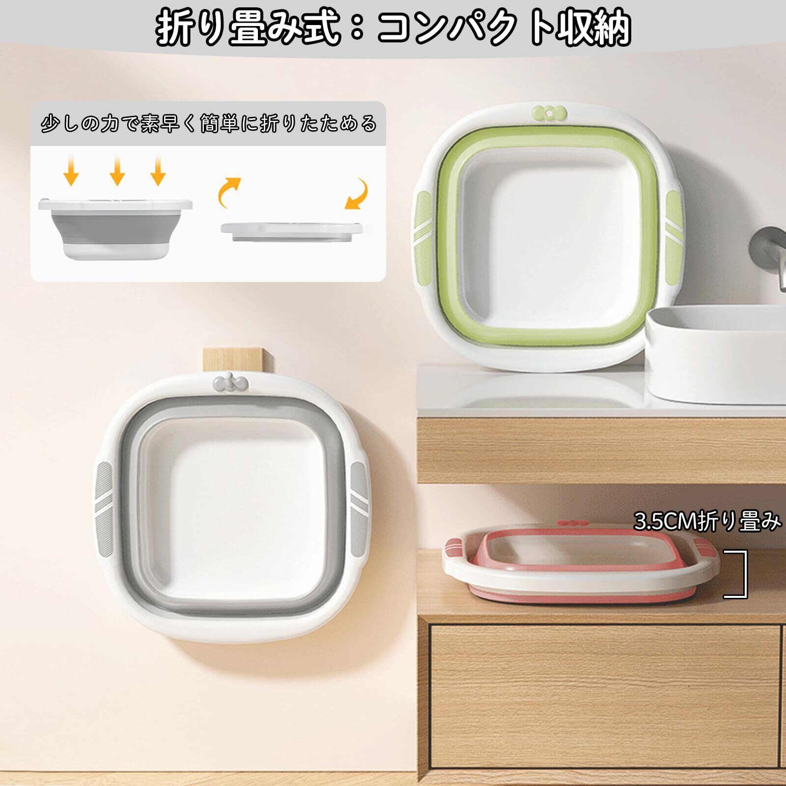 使いやすさと収納性を兼ね備えた折りたたみ式洗面器で、3サイズ(小:26×26cm、中:32×32cm、大:38×38cm)をご用意しています。高品質のPPとTPR素材でできており、無臭で耐熱性があります。使用時は十分な容量があり、使用しない時は約4~5cmに折りたためるので、限られた収納スペースでも場所を取りません。吊り下げ穴付きで、バスルームの壁に掛けて収納することもできます。磨耗に強い底面は、長時間の使用による磨耗を軽減します。グレー、グリーン、ピンクの3色展開で、コンパクトで実用的。
