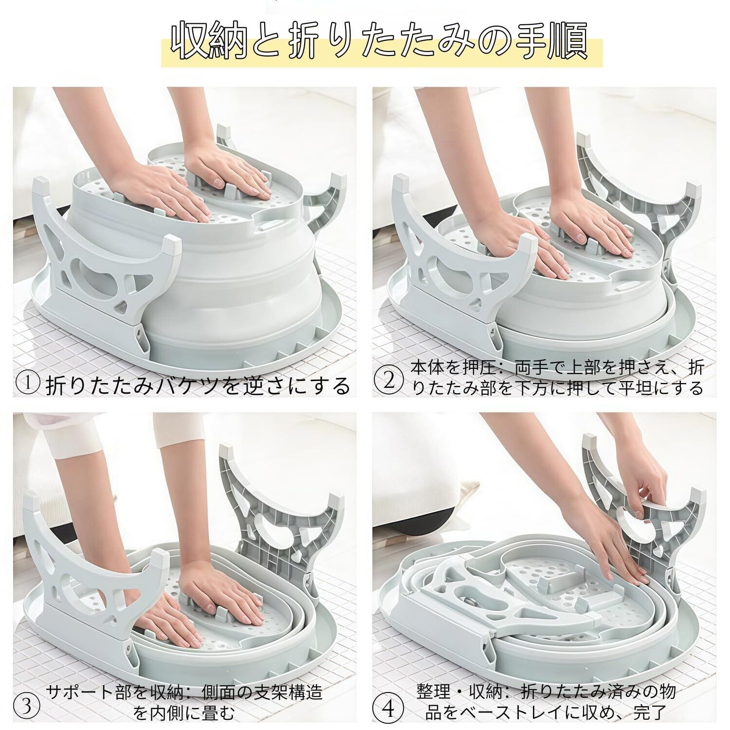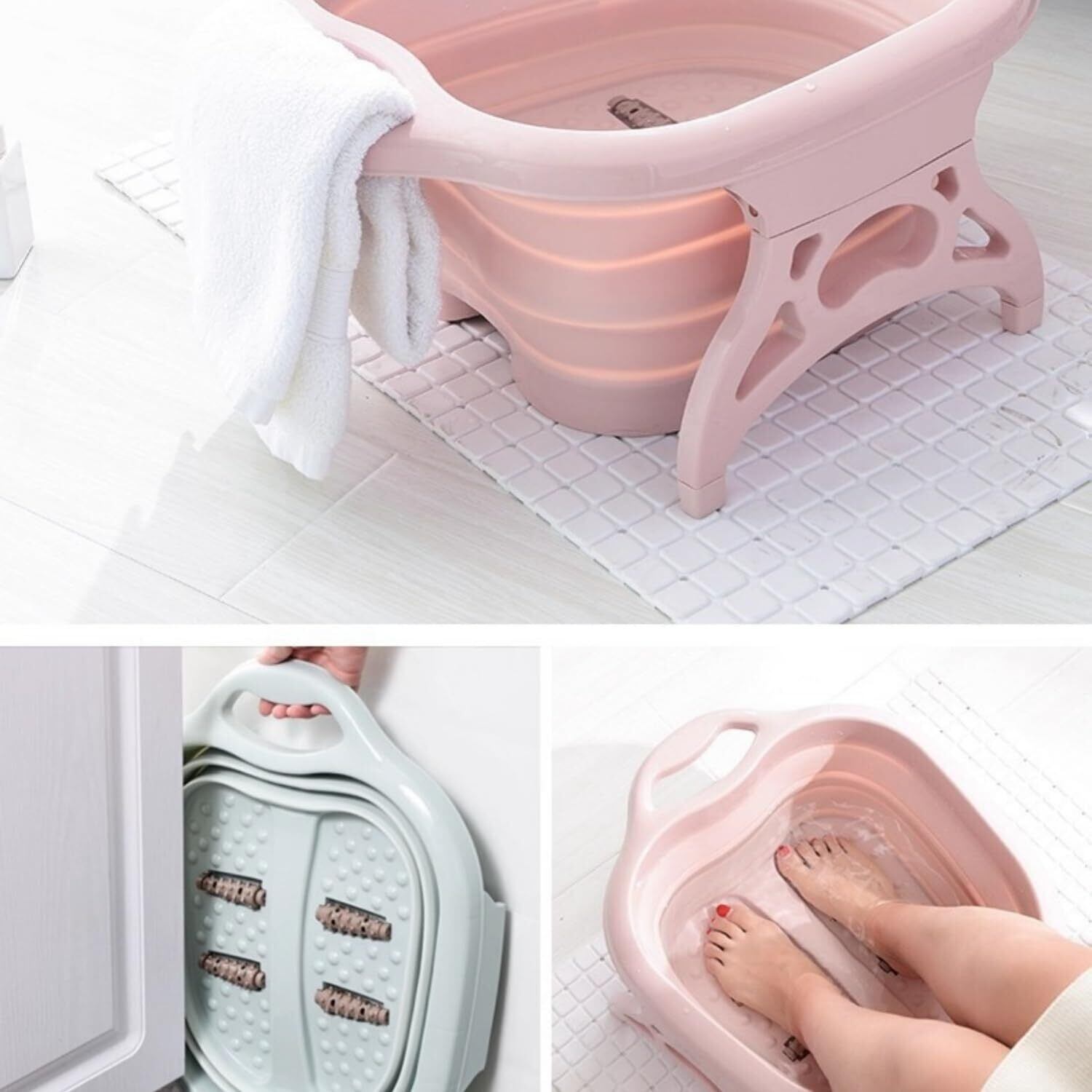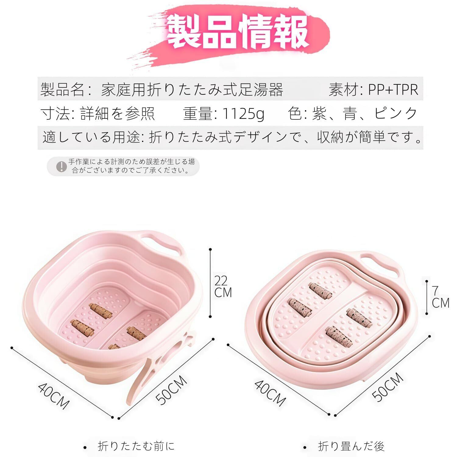 【折りたたみデザイン+多色選択で、収納と美しさを両立】折りたたみ可能な構造を採用し、折りたたんだ後の厚さはわずか 7cm で、浴室の片隅や洋服ダンスのすき間に簡単に収納できます;パープル、ピンク、ブルーと多色から選べ、様々なホームスタイルに適合し、実用的な足湯ツールであると同時に、浴室の格調を高める「キュートなアイテム」でもあります。
