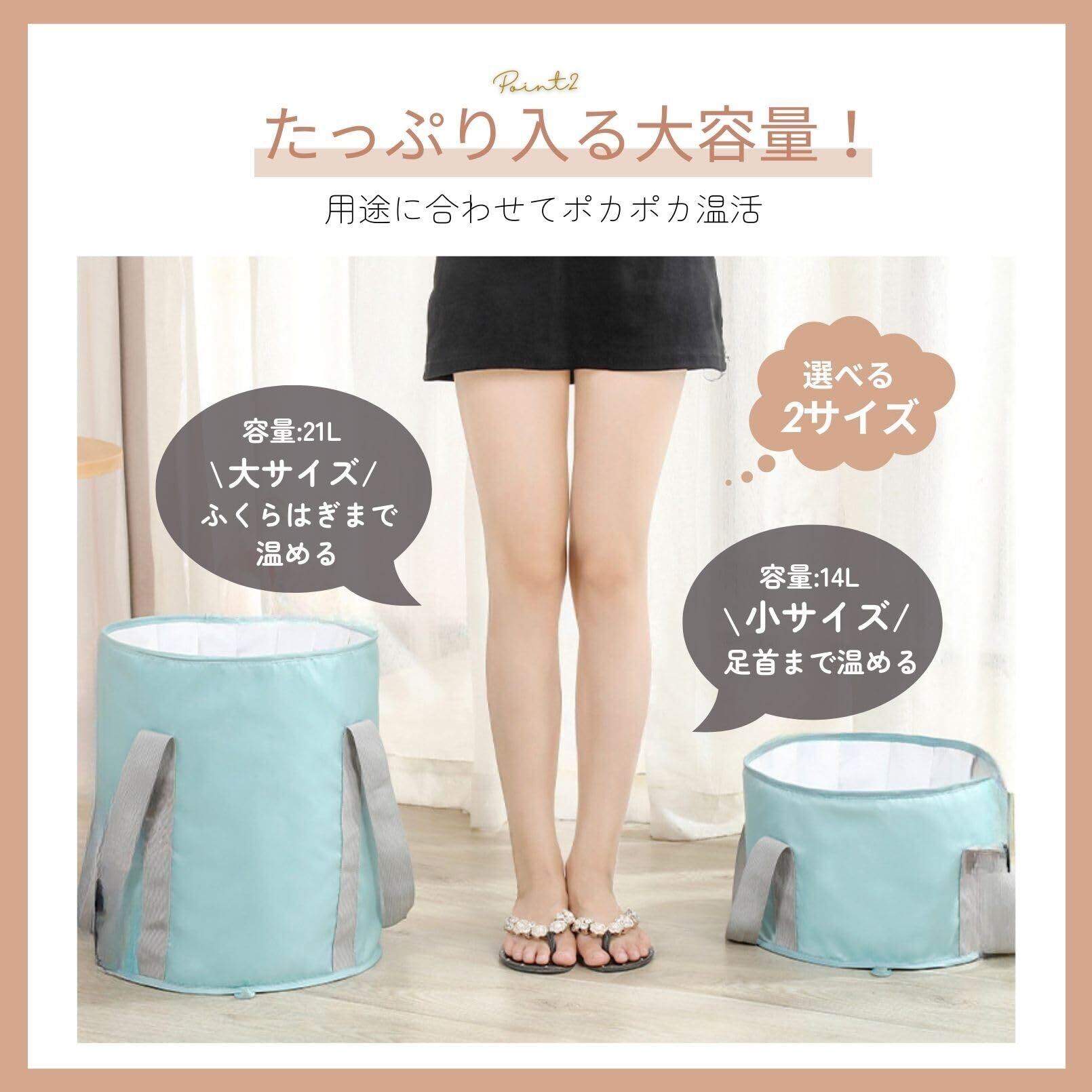 【大容量】14Lと21Lの大容量バケツ。足首までを温める小サイズと脹脛まで温める大サイズの2サイズ展開。足先を温めることで血流改善され全身ポカポカに。リラックス効果も期待できます!