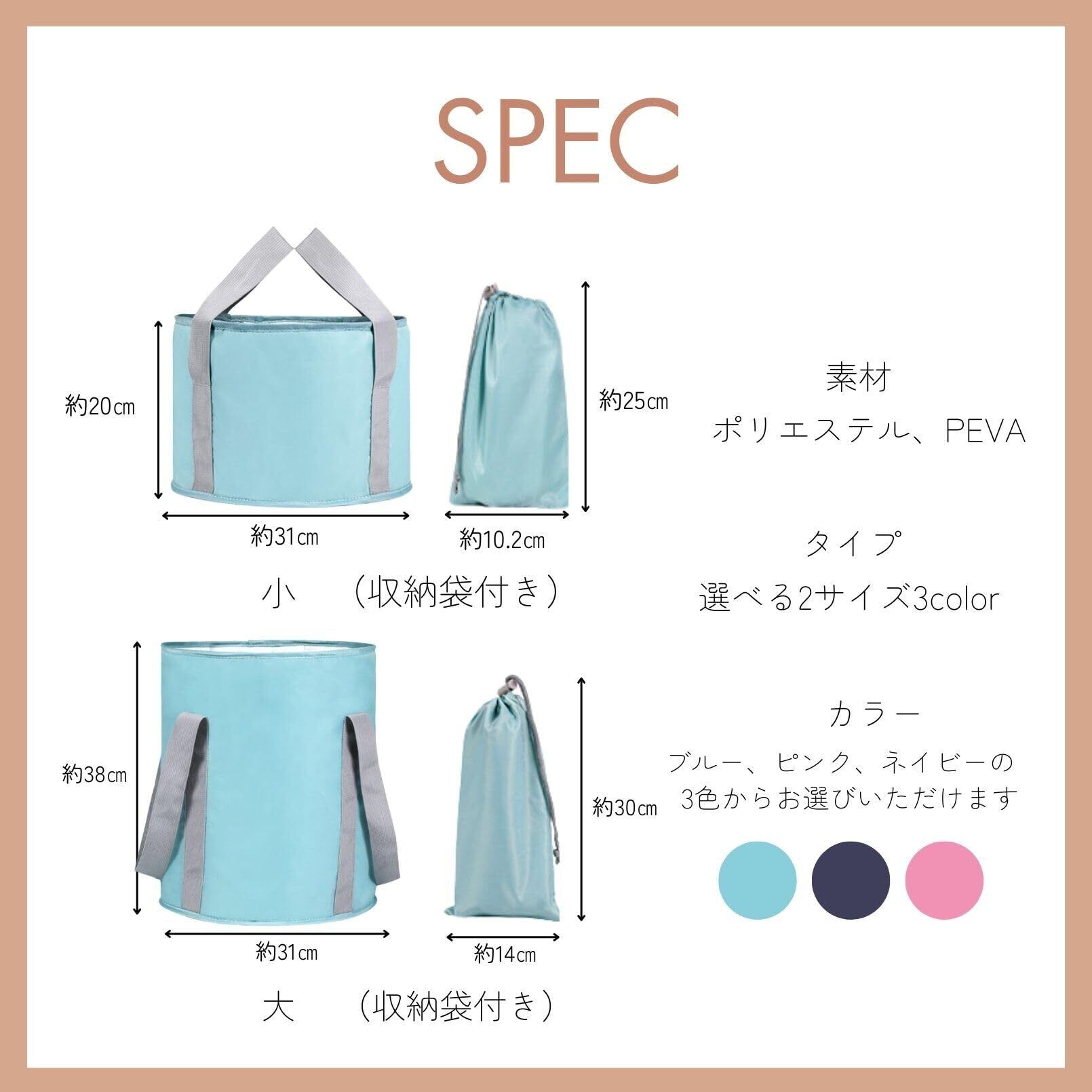 【商品仕様】サイズ 小:14L 大:21L カラー:ブルー・ピンク・ネイビー ※モニターの環境により、色の見え方に若干差が生じる場合がございます。※上記の数値は、実測によるものです。多少の誤差はご容赦ください。