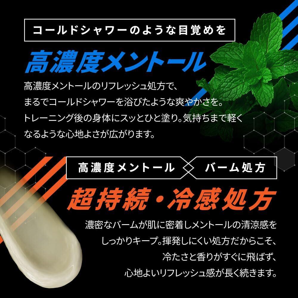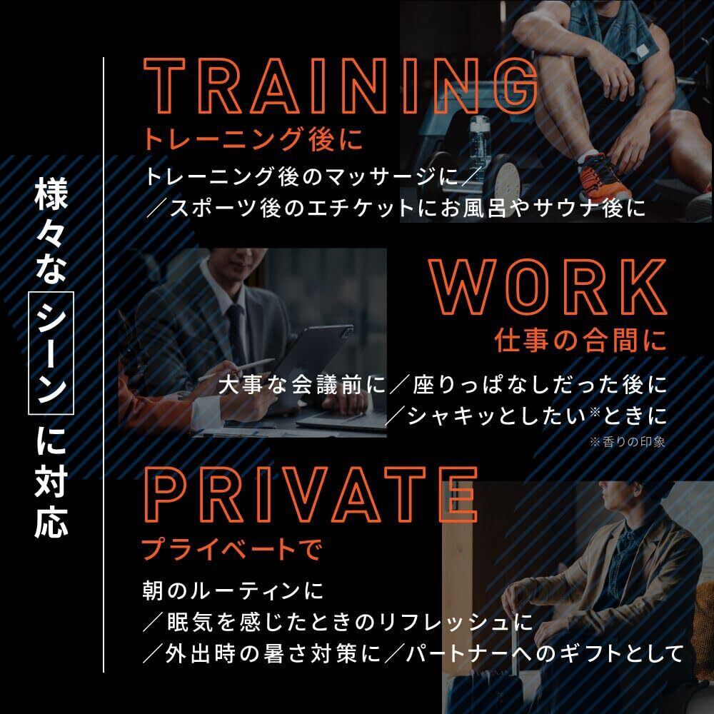 【 特徴 】 高濃度メントールによる冷感と、シトラスムスク調の爽やかな香りがトレーニング後のマッサージや、外出時のクールダウン、仕事や勉強の合間のリフレッシュに最適です。 ※顔や粘膜部位、および傷や肌に異常のある箇所には使用しないでください。