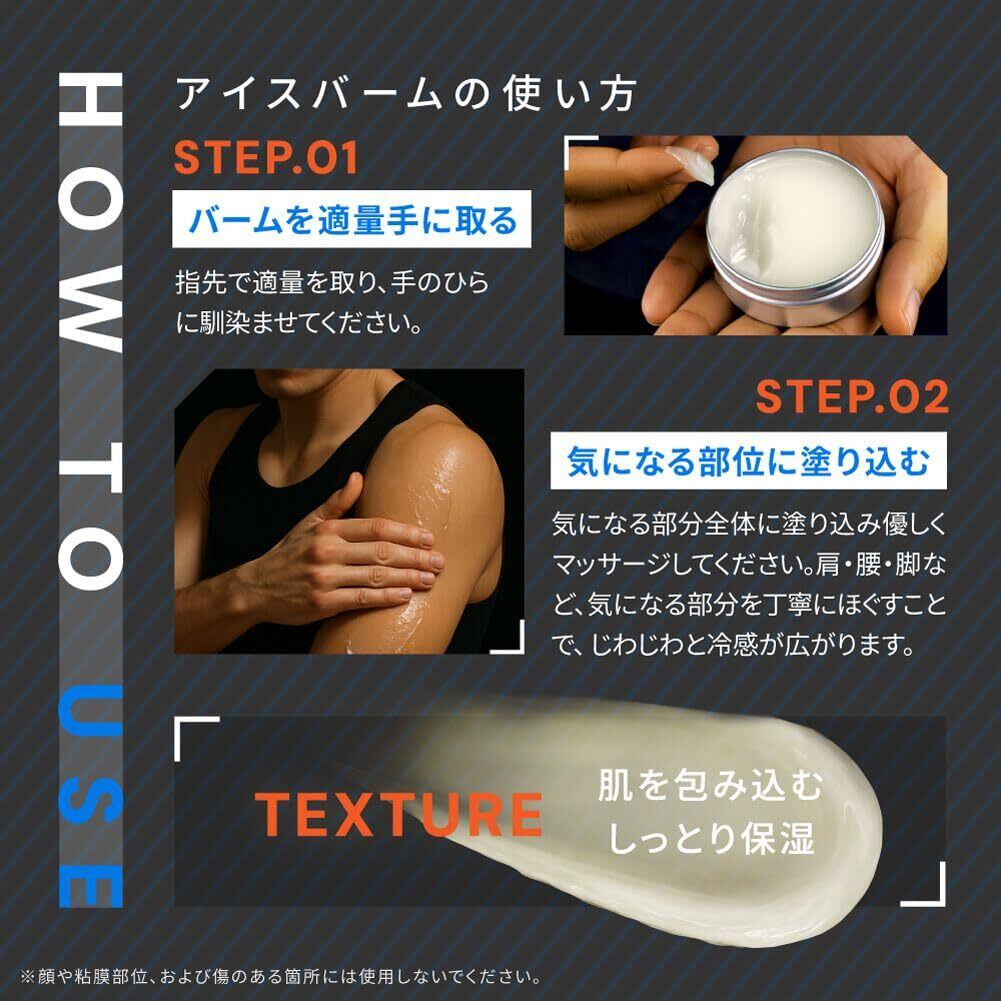 【 使用方法 】 こめかみ・首筋・肩・腕・腰・脚(太もも、ふくらはぎ)など、バームを適量手に取り、気になる部分に塗ってください。丁寧にほぐすことで、じわじわと冷感が広がります。 ※顔や粘膜部位、および傷や肌に異常のある箇所には使用しないでください。