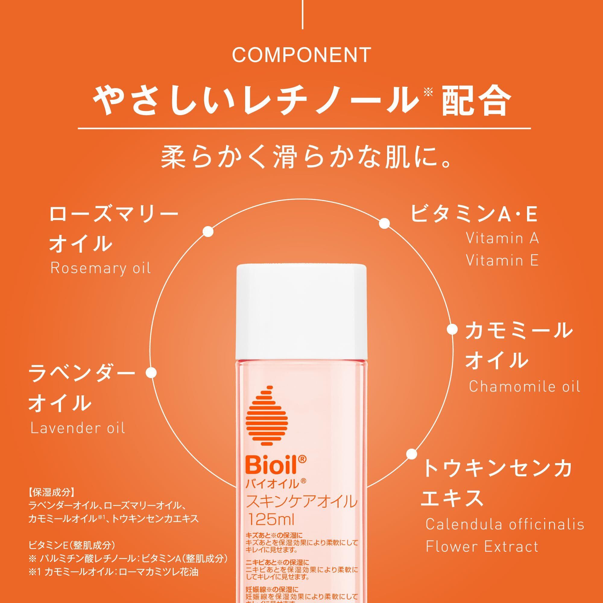 【やさしいレチノール*1・植物由来成分配合】 バイオイルは、レチノール*1や、独自成分ピュアセリンオイル*2、ビタミンEを配合。角質層の深部までスッと浸透し、肌を柔軟にしキレイに見せます。さらに、ラベンダーやカモミール*3、ローズマリーやトウキンセンカエキスなどの植物由来成分が、肌をやさしくケアし、肌に潤いと滑らかさを与えます。