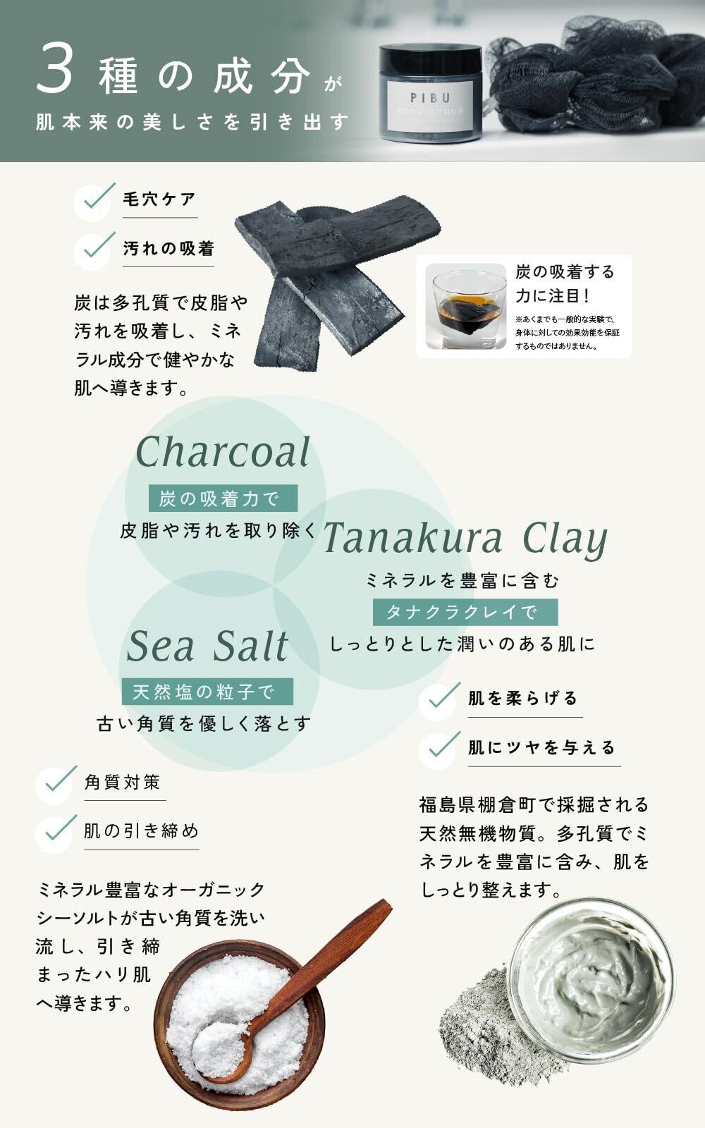 ・メイン成分:メイン成分としてチャコール、クレイ、ソルトの3つを配合している全く新しいボディスクラブ。だから角質除去やお肌の引き締めだけではなく、チャコールの毛穴ケアや汚れの吸着、クレイの肌を柔らかくして潤いを与えるなど、様々なことが期待できます。