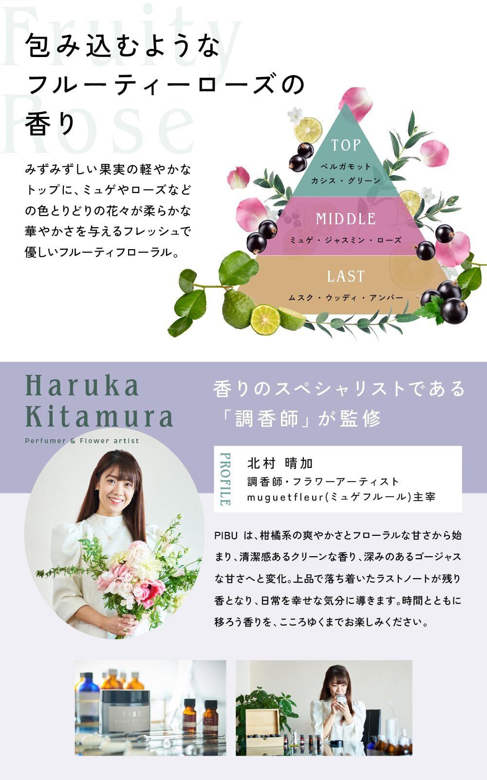 PIBU ボディスクラブ の1個です。商品の使い方ガイド付きです。 フルーティーローズの香りでお肌をきれいにしながら、リラックスできます。