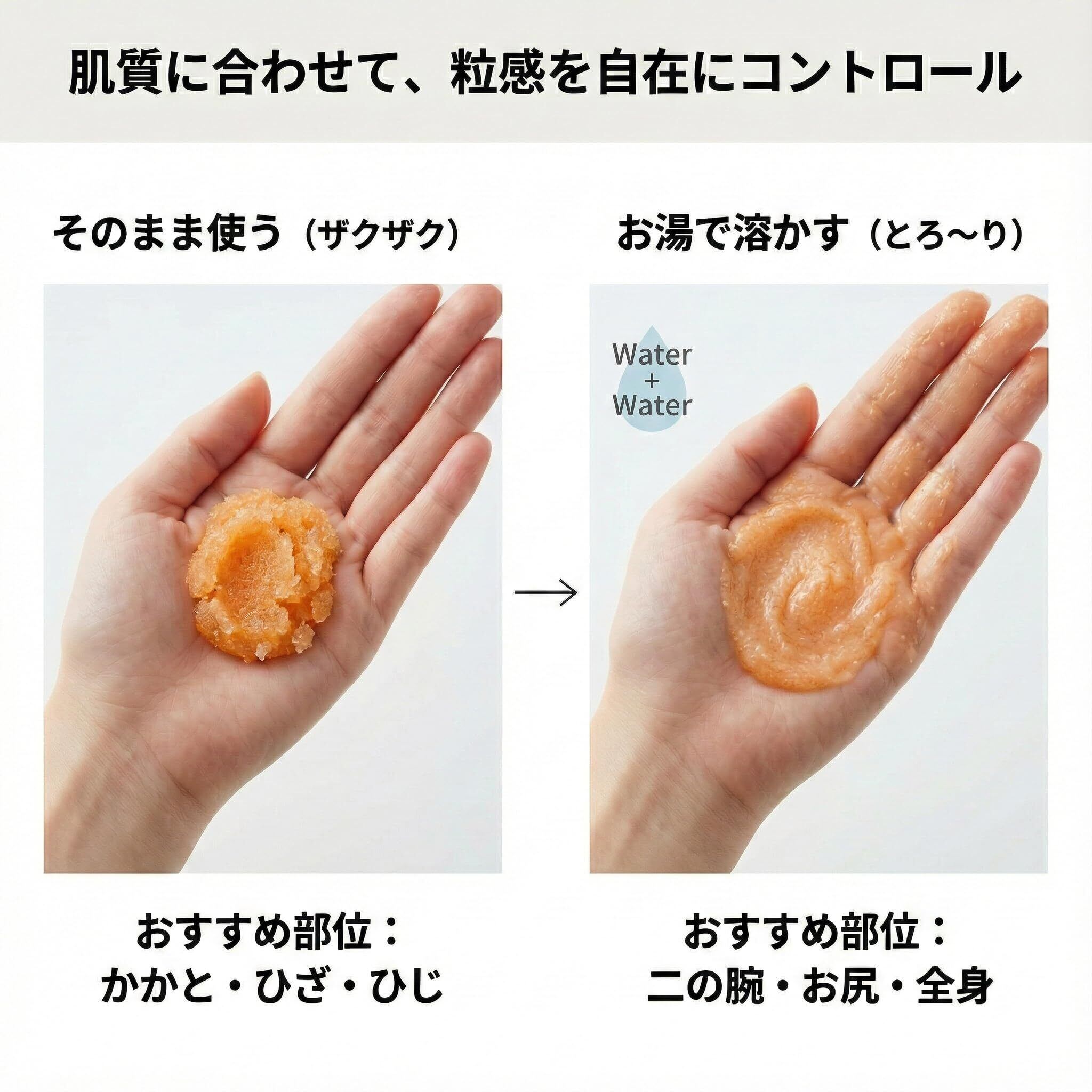 【痛くない使い方のコツ】 粒感がしっかりしているため、そのまま強くこすると刺激を感じる場合があります。 ポイント: 手のひらで少量のお湯(またはぬるま湯)と混ぜ合わせ、ペースト状に少し溶かしてから肌に乗せてください。角が取れてマイルドになり、痛みを感じずに心地よくケアできます。