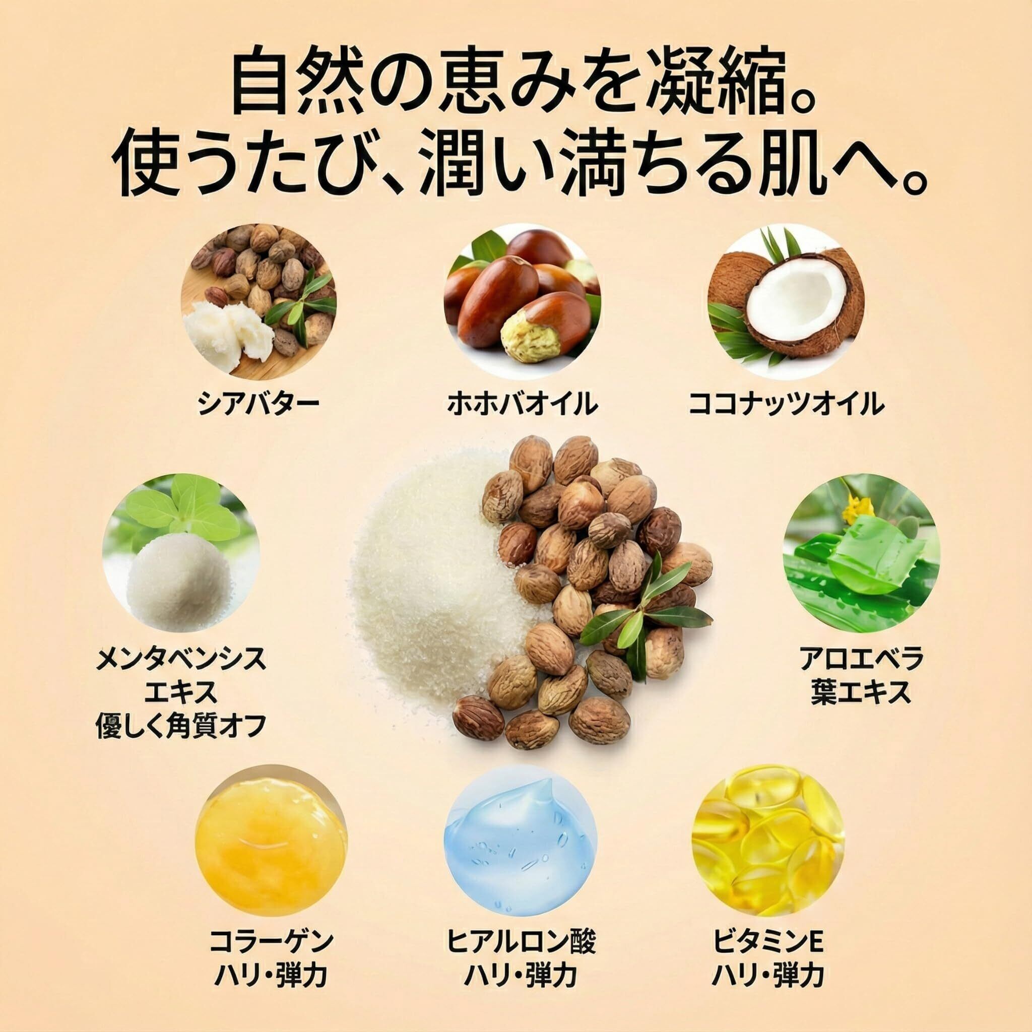 【洗い上がりはシアバターでしっとり】 角質をオフした直後の無防備な肌を、配合されたシアバターやオイルが即座に保湿。ハードな使用感とは裏腹に、洗い流した後は驚くほどモチモチの仕上がりに