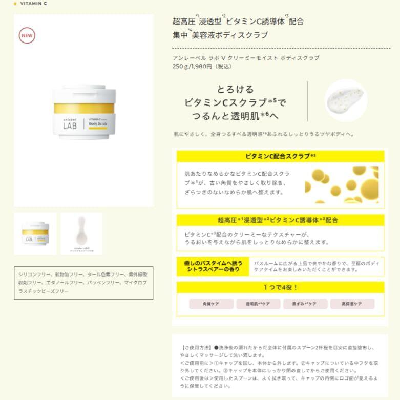 アンレーベル ラボ 超高圧※1浸透型※2ビタミンC誘導体*配合。集中※3美容液ボディスクラブ。シトラスペアーの香り。肌にやさしく、全身つるすべ&透明感※4あふれるしっとりうるツヤボディへ。※1超高圧加工処理装置を用いた原料。※2角質層まで。※3気になる部分へ集中的に使用。※4古い角質や汚れを落とすことによる。*超高圧処理したテトラヘキシルデカン酸アスコルビル(保湿成分)