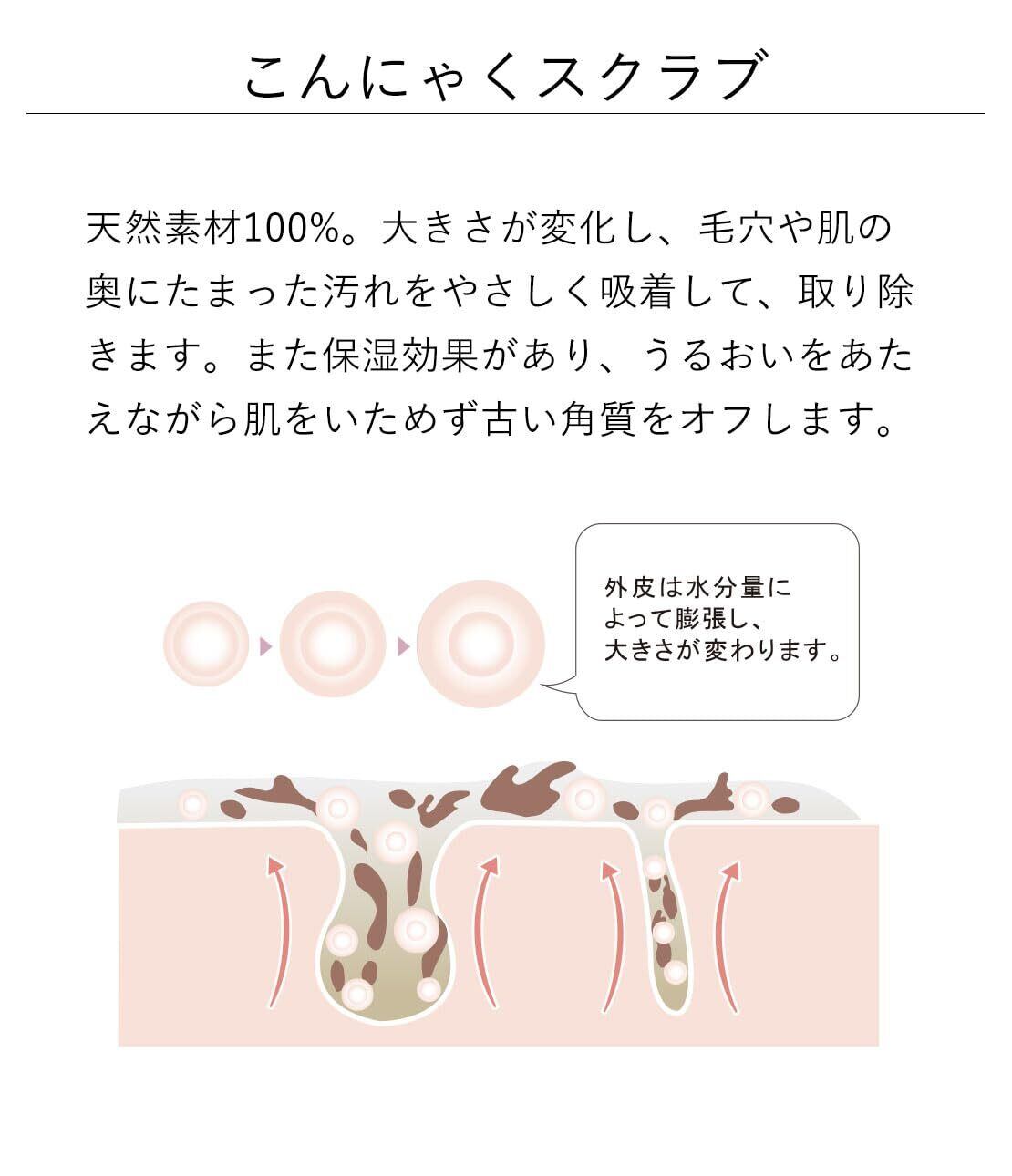 ❷こんにゃくスクラブ(グルコマンナン)配合。水分で膨張するスクラブ粒子が、毛穴・年齢サインに対応。摩擦で肌に負担がかかりやすいバストまわりの皮脂汚れ・古い角質に吸着し、しっとりオフ!