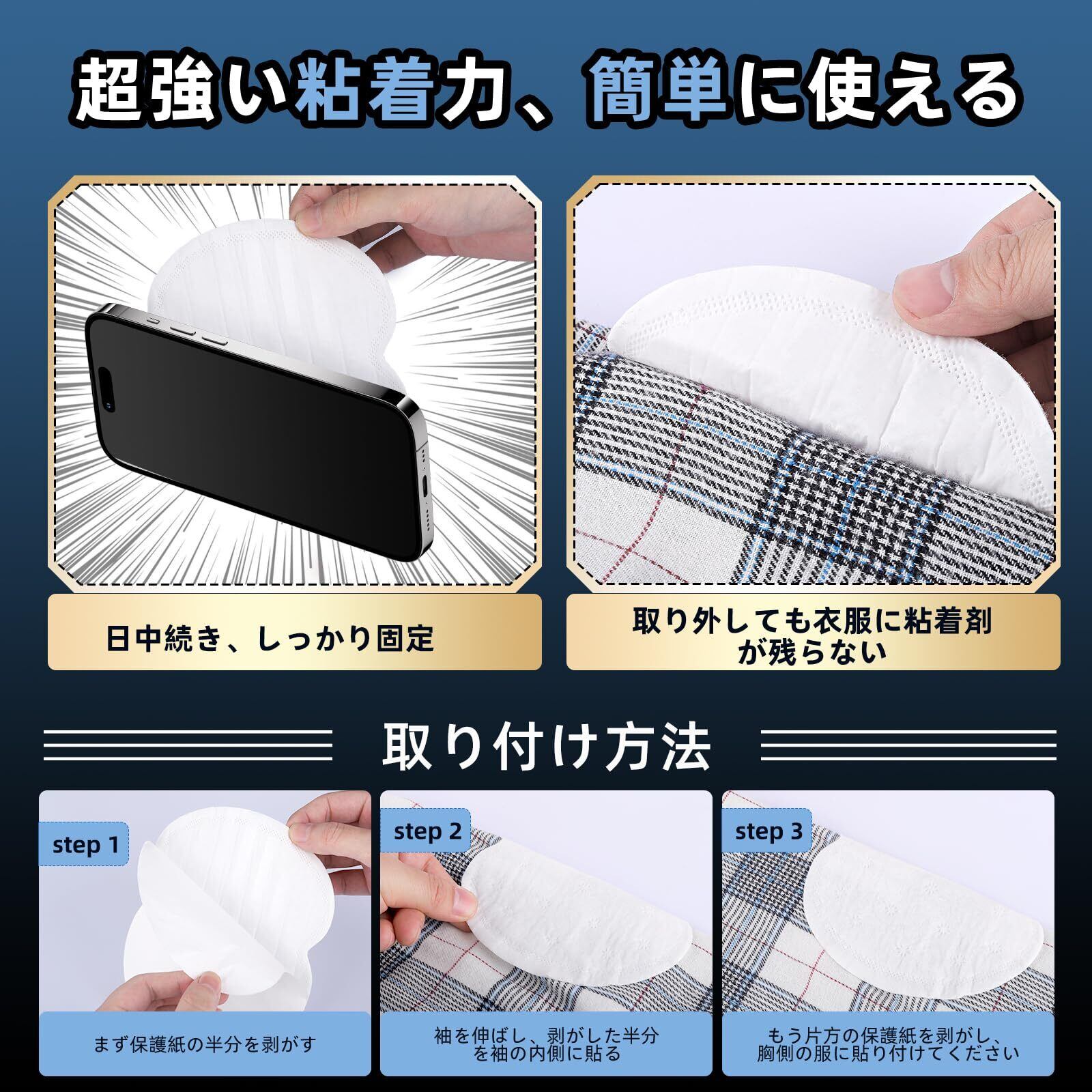 【大判3Dガード】カンタンに貼付可能。はがれにくい・ずれにくい・衣類を傷めにくい。3シート特殊構造で汗を素早く吸収し、1日中サラサラ。