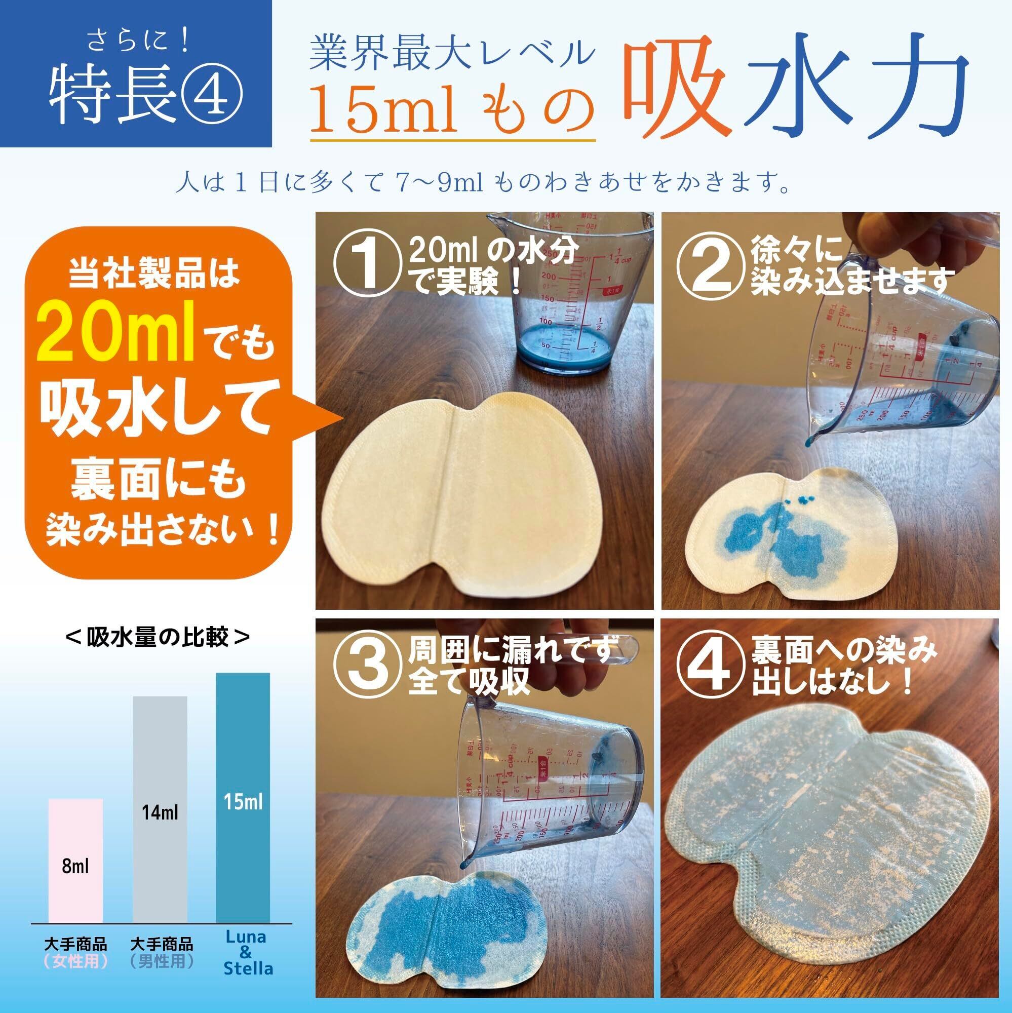 【15mlの圧倒的吸収力!メンズ級の安心感】 一般的な汗脇パッドを凌駕する最大15mlの吸水量を実現。大汗・多汗でお悩みの方や、一般男性向けの強力な吸収力を求める方に最適です。脇汗を素早く閉じ込め、大切なシャツやジャケットへの汗染み・黄ばみを徹底ブロック。長時間の会議や外出でも、1日中サラサラな状態をキープします。