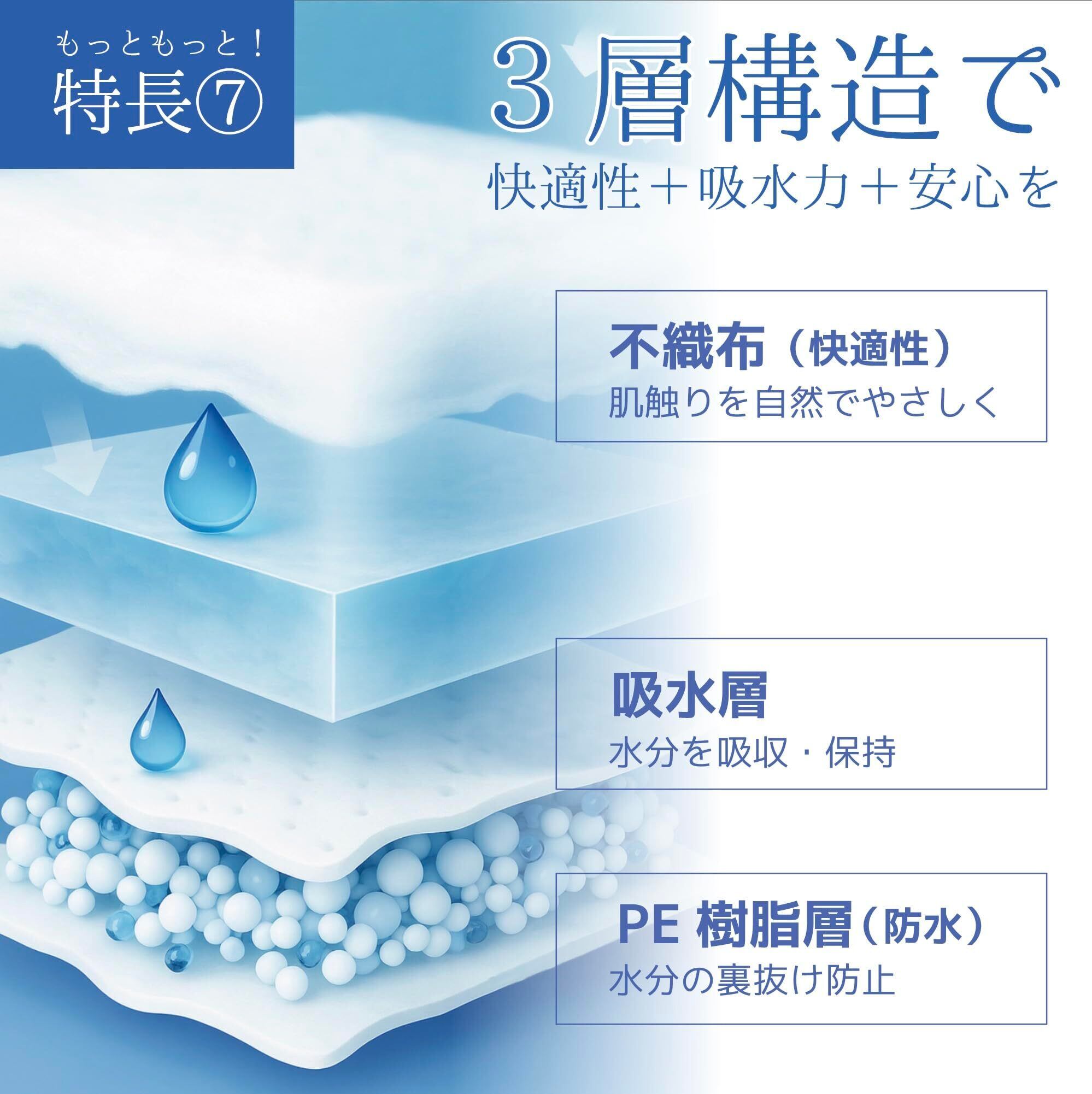 【極薄設計で付けてる感ゼロ!驚きの着け心地】 吸水量はパワフルながら、本体は極薄かつソフトな肌触り。ゴワつきや違和感を最小限に抑え、「ほぼ付けている感覚がない」ほどのフィット感を実現しました。肌への負担が少ない素材を使用しているため、レディース・メンズ問わず、敏感肌の方や長時間の着用でも快適にお過ごしいただけます。