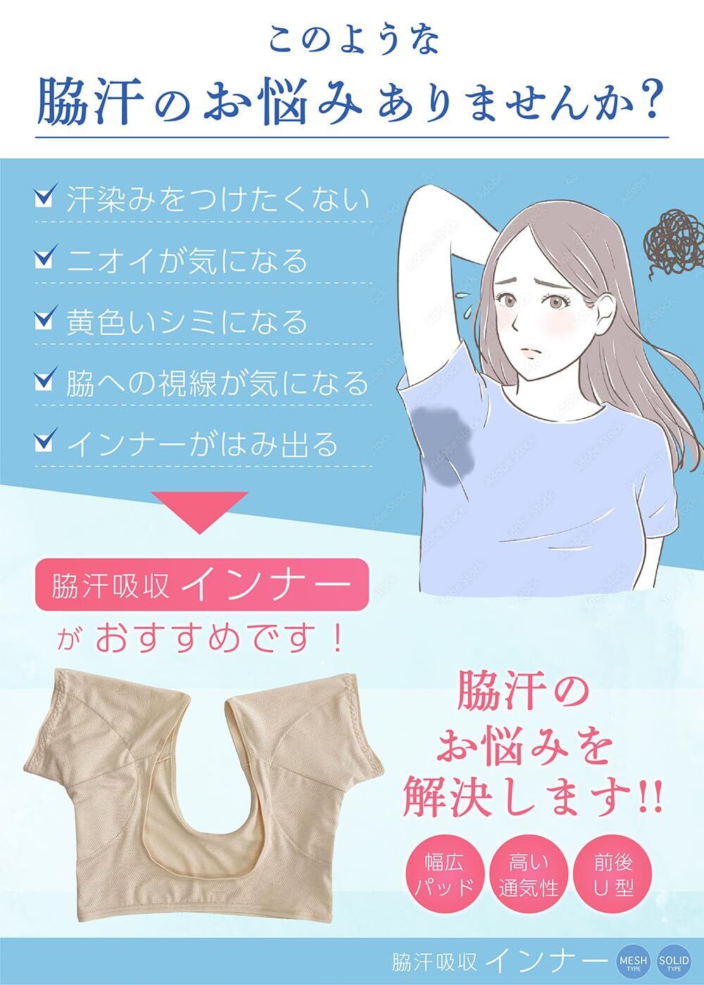 【商品仕様】女性用のインナーとなります。素材には高品質なメッシュ素材あるいはソリッド素材をご用意しています。メッシュ素材は風通しがよく、熱を逃すためムレにくいのが特徴です、ソリッド素材は接触冷感があり、ひんやり気持ちよく、さらっとした肌触りが特徴です。