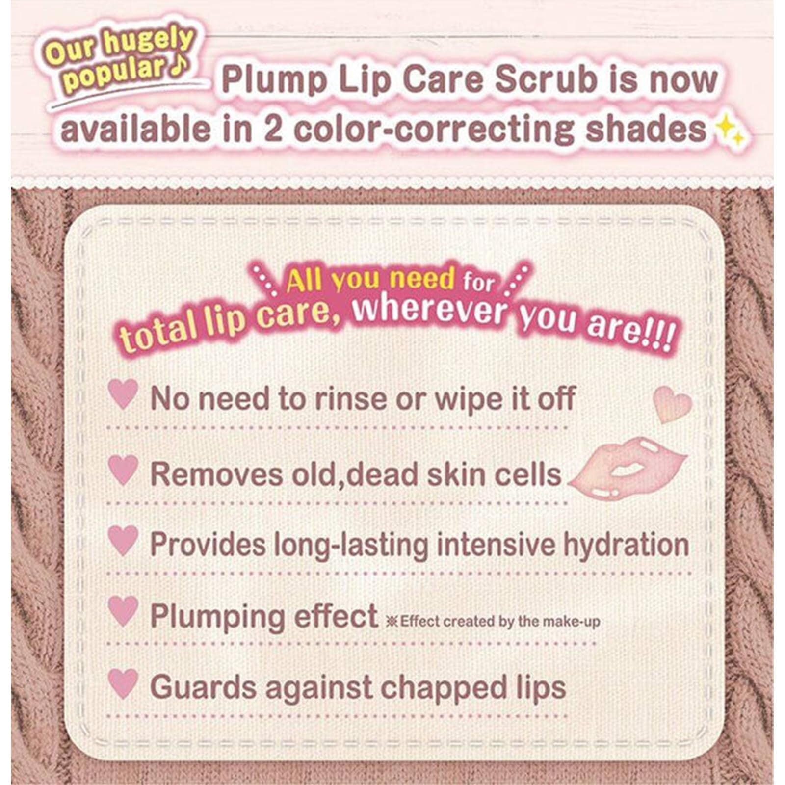 塗るだけで手軽に「柔らか唇エステ」潤いケアと角質ケアが1本で簡単に出来るリップスクラブ。唇の上で溶けるお砂糖(※スクロース:スクラブ剤)のスクラブが古い角質をoffし、プランパー効果も兼ね備えているので、「ガサガサ」「くすみ」をケアしてなめらかでふっくらとした唇に仕上げます(※メイク効果による)。まるでリップパックした後のような保湿効果が持続。デイケア/ナイトケアどちらにもおすすめ。