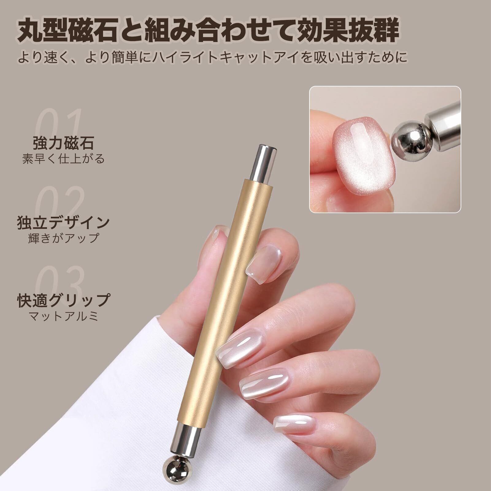 【球形マグネットで立体感のある輝きを】業界初のボール型マグネットを採用。丸みのある光のアーチを簡単に作れるので、初心者の方でも成功率がアップ。ベーシックで上品なキャッツアイデザインを素早く仕上げたい方におすすめです。