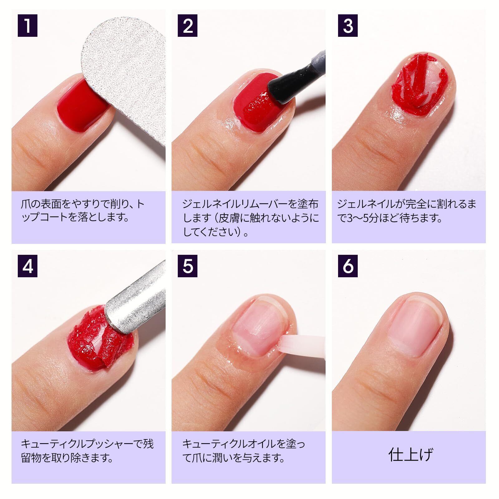 【2~5分でスピーディーにオフ】リムーバーを爪に塗布して数分待つだけで、ジェルが自然に浮き上がり、付属のメタルプッシャーで軽く押すだけで簡単にオフできます。アルミホイルやコットンパッドを使う必要はありません。ジェルネイルを効率的かつスピーディーに除去します。