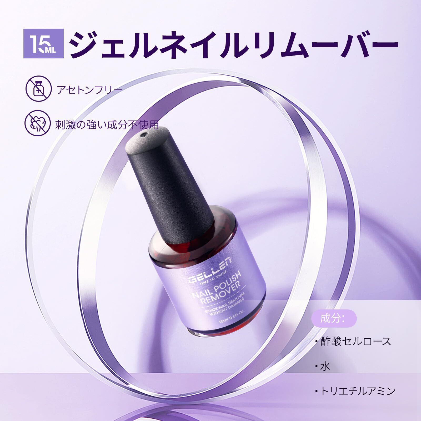 Gellen ジェルネイルリムーバー 15ml 除光液 アセトンフリー 簡単オフ 爪にやさしい セルフネイル用 ジェルオフリムーバー スチールプッシャー付き 3~5分で素早く除去