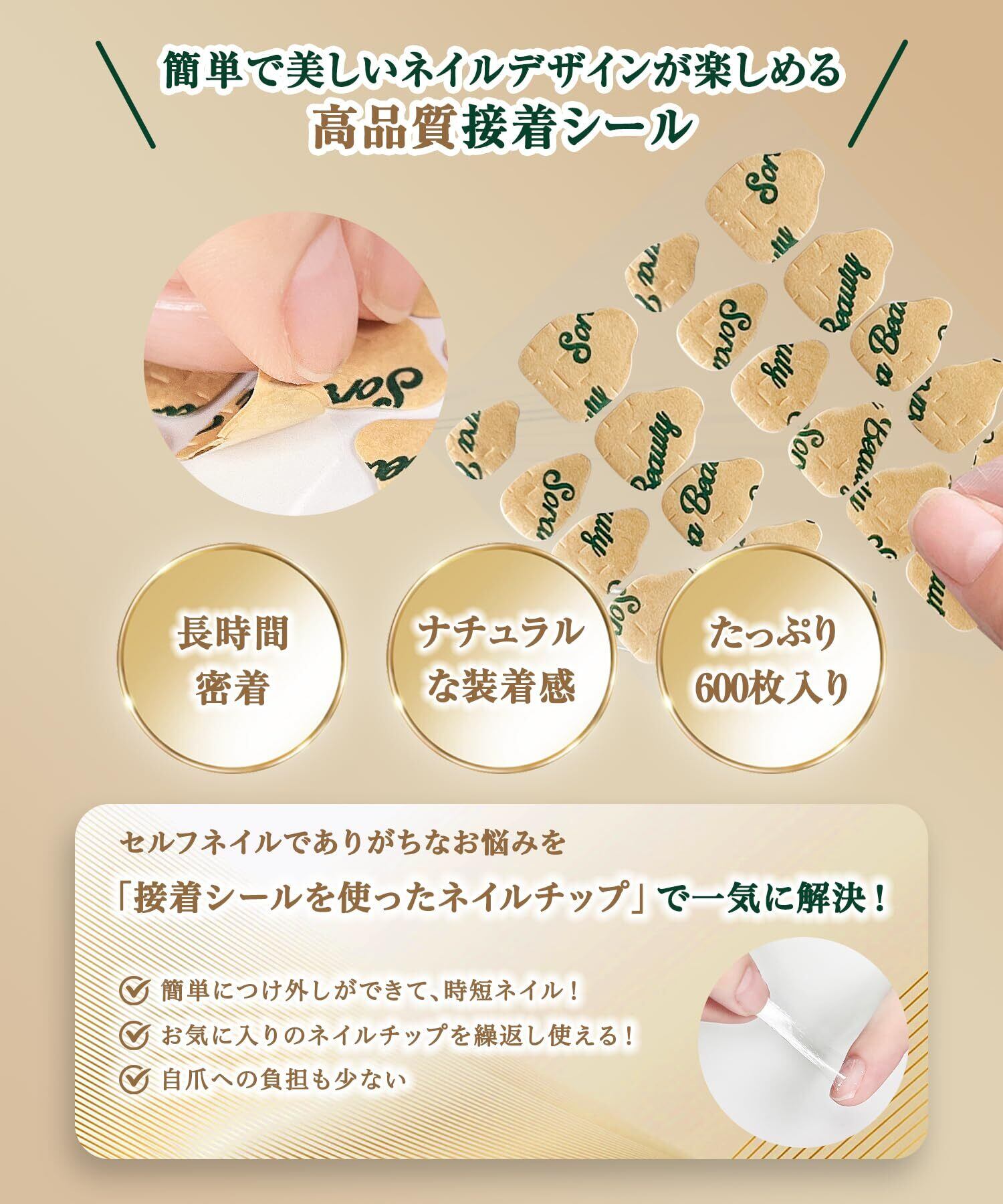 【大容量で長持ち】 600枚入りの大容量なので、ネイルチップを付けたい時にいつでも手軽に使えます。 シート1枚で5~7日分ご利用いただけ、粘着シール25シートで約半年間ネイルアートを楽しめるため、すぐに使い切る心配もありません。
