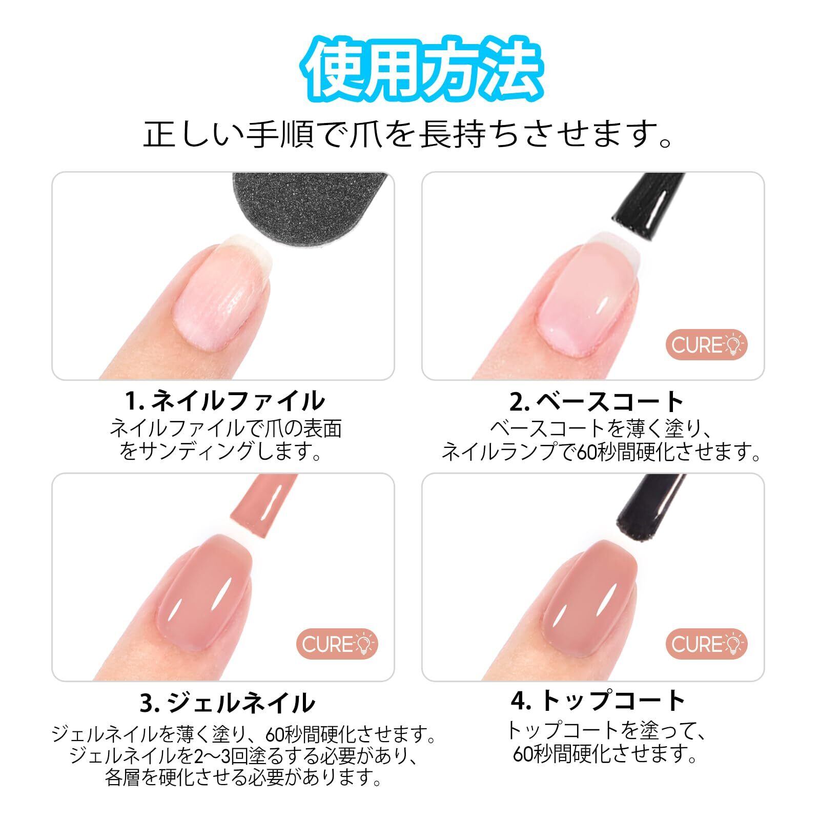 長持ち:U V/LEDライトで硬化必要です。正しく使用する場合、少なくとも3週間維持でき、浮きや剥げもないです,ゴージャスな光沢を保ちます。