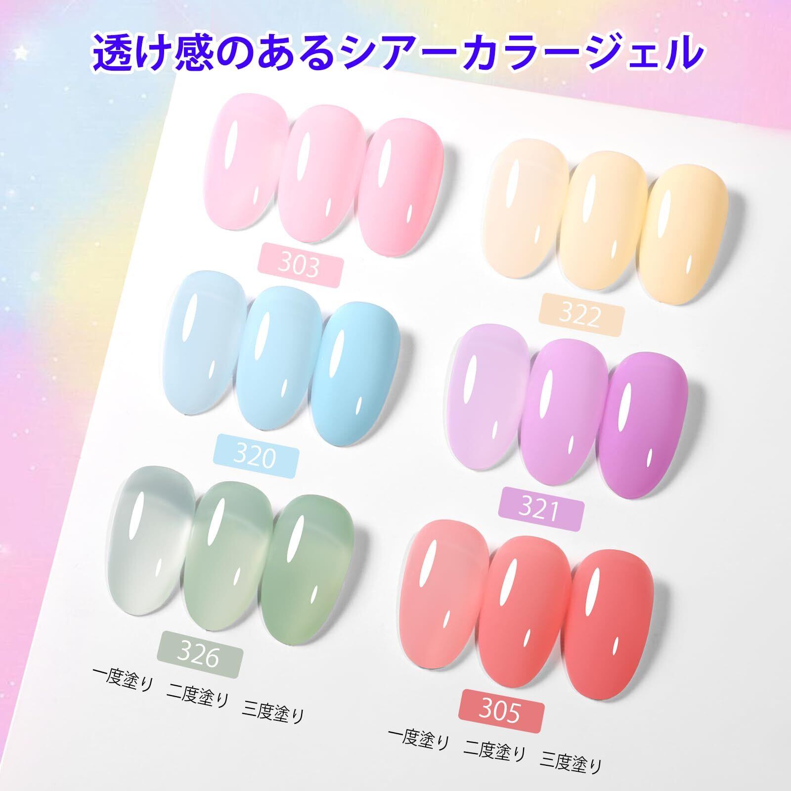 透明感&異なる効果:透け感とツヤ感があります。薄く塗ると、ゼリーのようなみずみずしい透明感が得られます。シアーカラージェルを2層または3層塗ると、異なるスタイルが得られます。