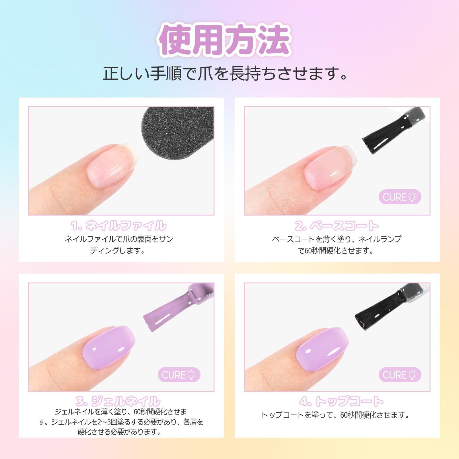 パステルカラー:春夏に最適なピンク、パープル、レッド、イエロー、グリンー、ブルーの6本カラージェルセット。カラーは肌馴染みなので、通勤と日常生活にどんな場合でも使えできます!自分の好みに合わせて様々な色の組み合わせを楽しめます。