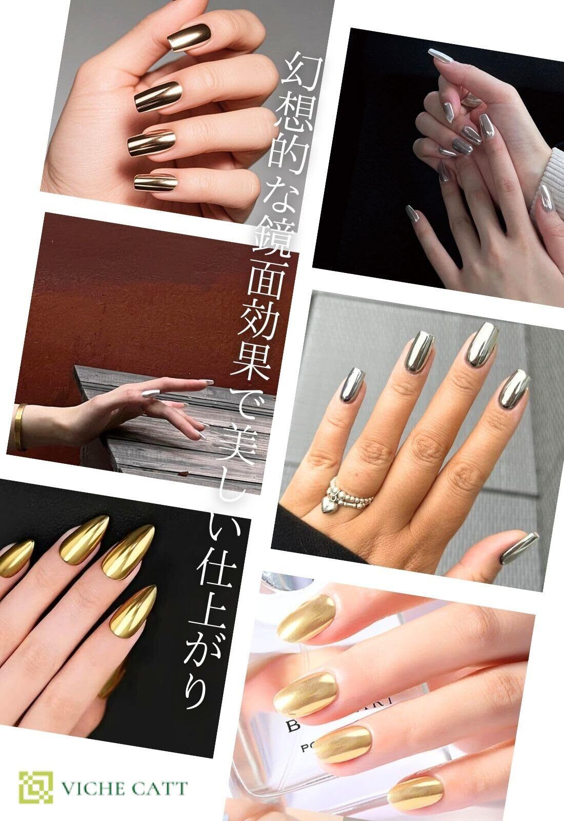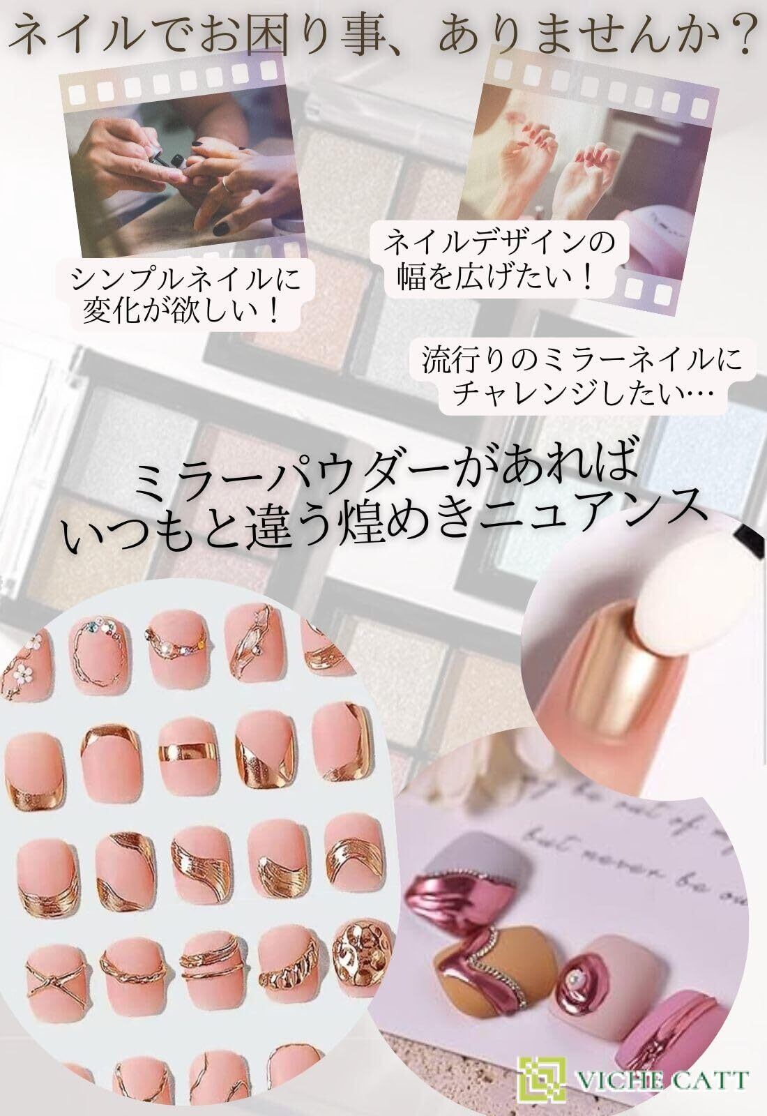 ミラーパウダーを使用するだけで驚くべき鏡面効果で幻想的な仕上がり! 厳選された4色で組合せも楽しいです。 使い方はとても簡単↓ 細かい微粒子を付属のチップでパウダーを爪にこすりつけるだけで綺麗なミラーネイルが完成。 ノンワイプトップジェルを使ってオリジナルデザインを作ったり、全面に付けて爪全体をミラーネイルにしたり部分的にミラーデザインにしても◎ 無限大に創作デザインが楽しめます。