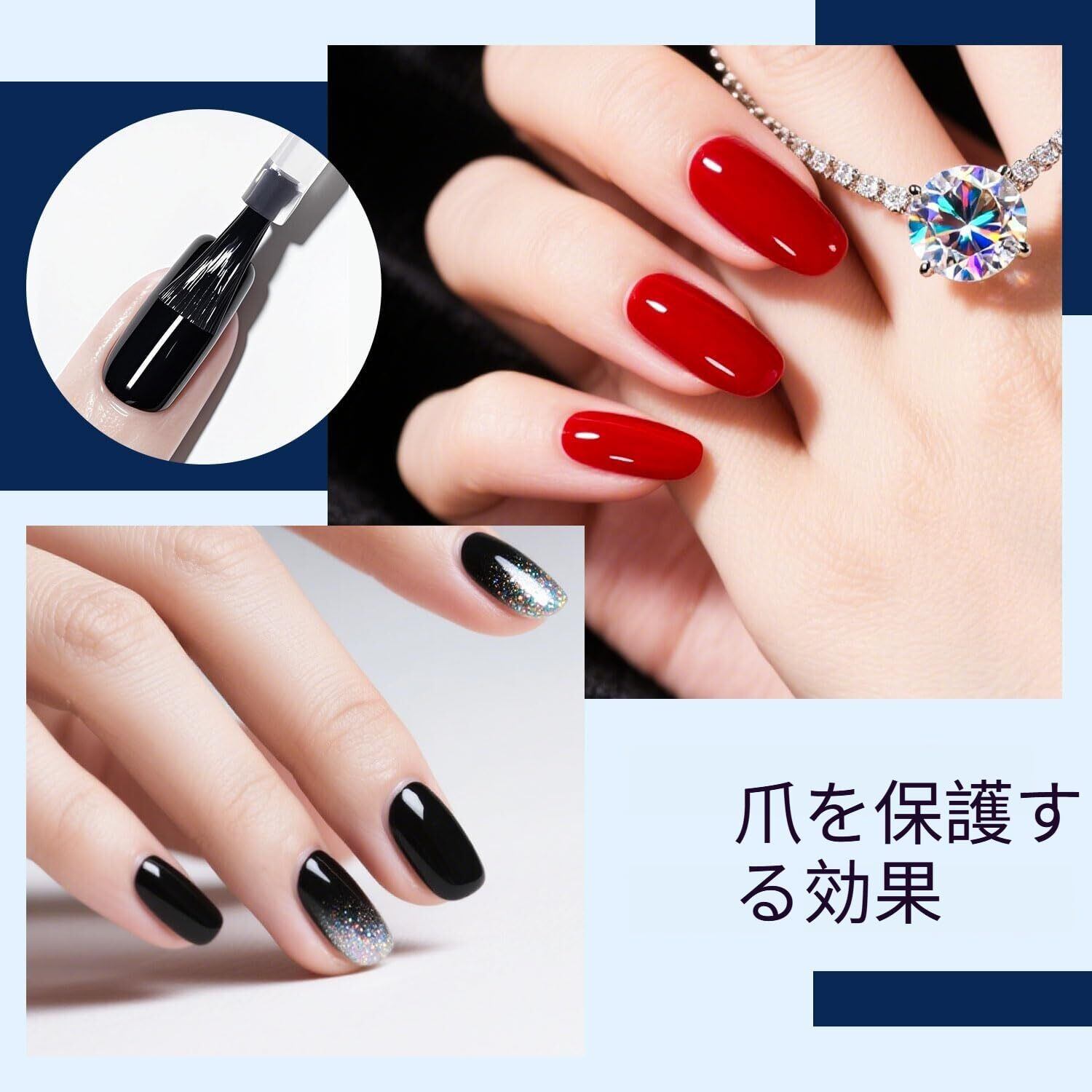 耐久性:ネイルアートの耐久性を高め、持続時間を延ばし、21日間以上完璧な輝きを保ちます。