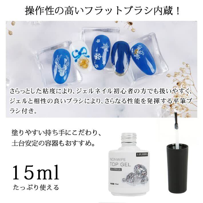 【トップジェル】 硬化後のベタベタした未硬化ジェルが出ないから、硬化後の拭き取り不要。 ワイプやクリーナーなど不要で経済的〇。拭き取りで曇ることや、ふき取りの際にワイプでの表面を傷つけることもなく硬化だけで美しいネイルが完成! ブラシ付きにより利便性のよさに加え、クリスタルのような美しい輝きを放つおすすめの「LULUトップジェル」。