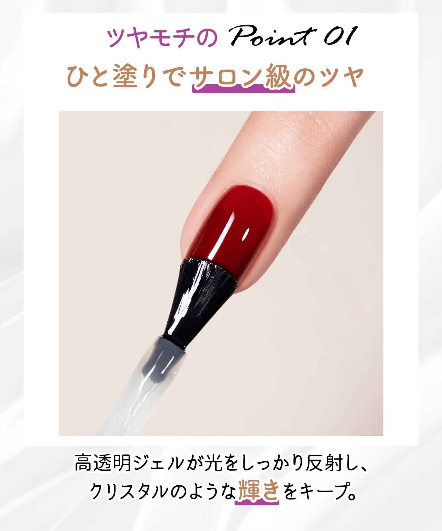 ・高耐久設計でツヤ長持ち ひび割れや欠け、剥がれを防ぎ、ジェルネイルの美しい状態を長時間キープ。 日常生活の中でもツヤ感が持続し、仕上がりの満足度を高めます。 ベース・カラージェルの保護にもおすすめです。