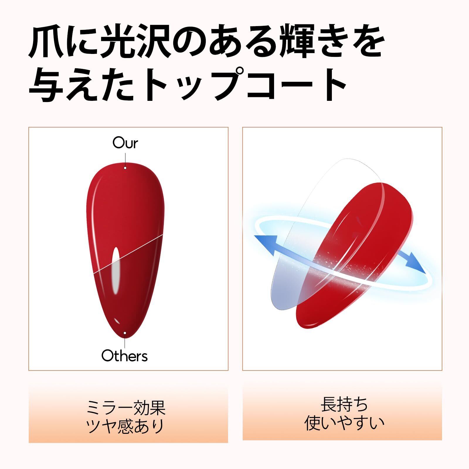 トップコート&光沢感:爪に光沢のある輝きを与えたトップコートは拭き取り不要なので、綺麗なネイルを作成する時間が大幅に短縮できます。美しい透明感で、黄ばまない、ネイルを保護し長持ちさせます。