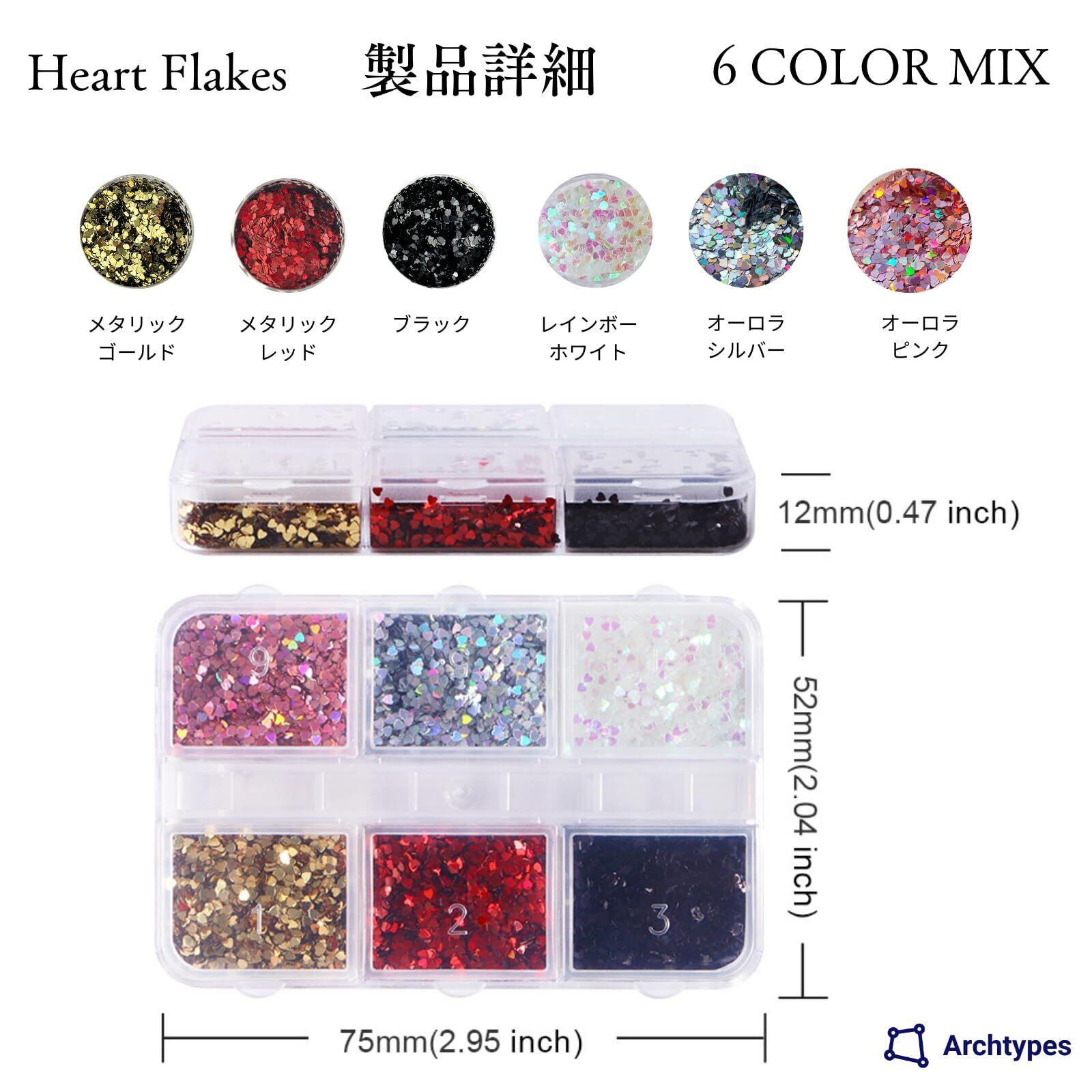 とても小さな1mmサイズの可愛いハート型のホログラムの6色セットとなっております。ホログラムなので、光の角度によって色が変わります。ネイルアートに使用する場合は、ジェルネイルやデコネイルで、爪にキラキラした輝きを加えます。また、クラフトアクセサリーとして、レジン封入やガラスドームの装飾にもご利用いただけます。