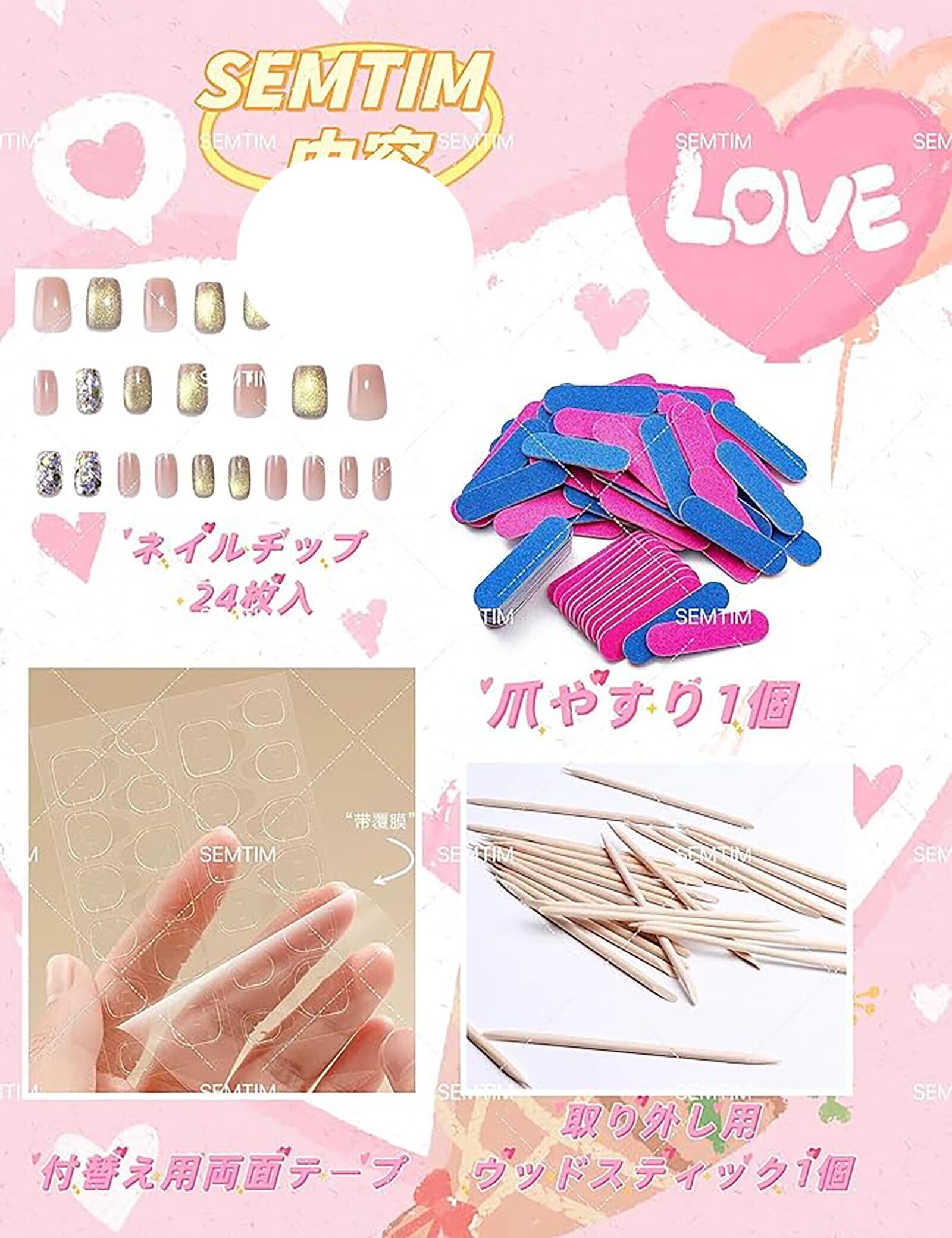 【内容】ネイルチップ30枚+付替え用両面テープ+取り外し用ウッドスティック1個+爪やすり1個。