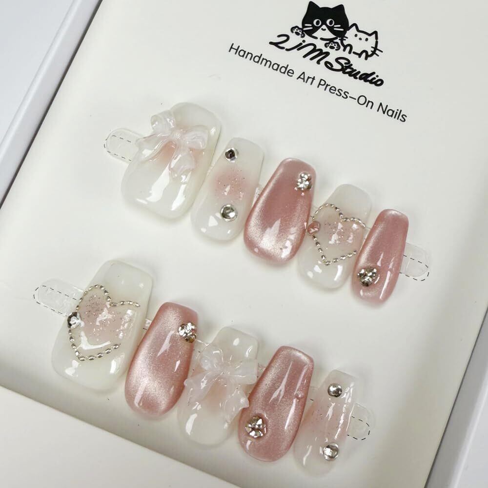 ネイルチップ 10枚入 職人仕上げ 和風ミニマルデザイン 上品シンプル ドット柄 リボン ハート スター 花火モチーフ 手作りサロン級 フォトウェディング 結婚式 成人式 オフィスネイル 卒業写真 デート ショッピング パーティー 高級レストラン 両面テープ・木棒・爪やすり付き 人気つけ爪 (リボンシュガー, M)