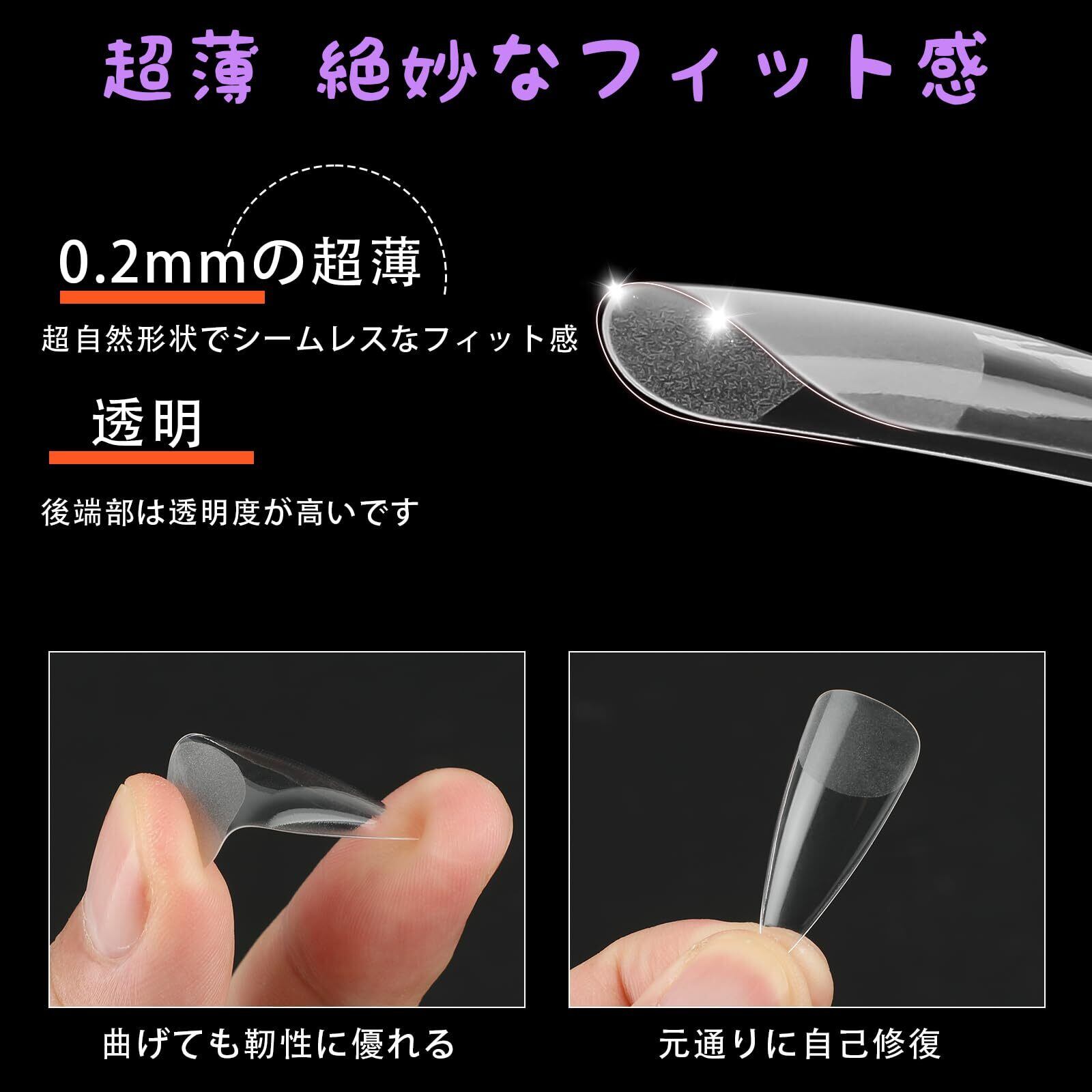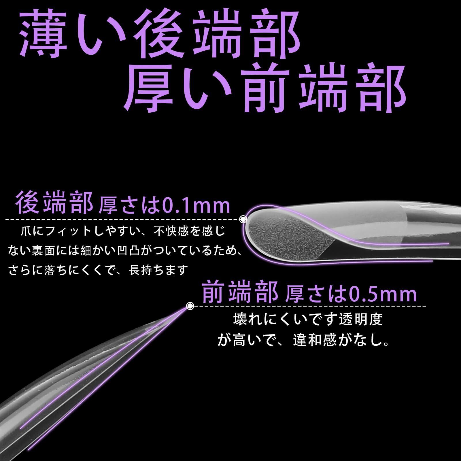 自然なフィット感:チップ自体が薄くて自爪並みに馴染みます。後端部は薄くで、前端部は厚いです。ネイルチップ全体が爪にフィットしやすくなり、不快感を感じなくなります。強化するとしっかり固定するのでかなり持ちもいいです。