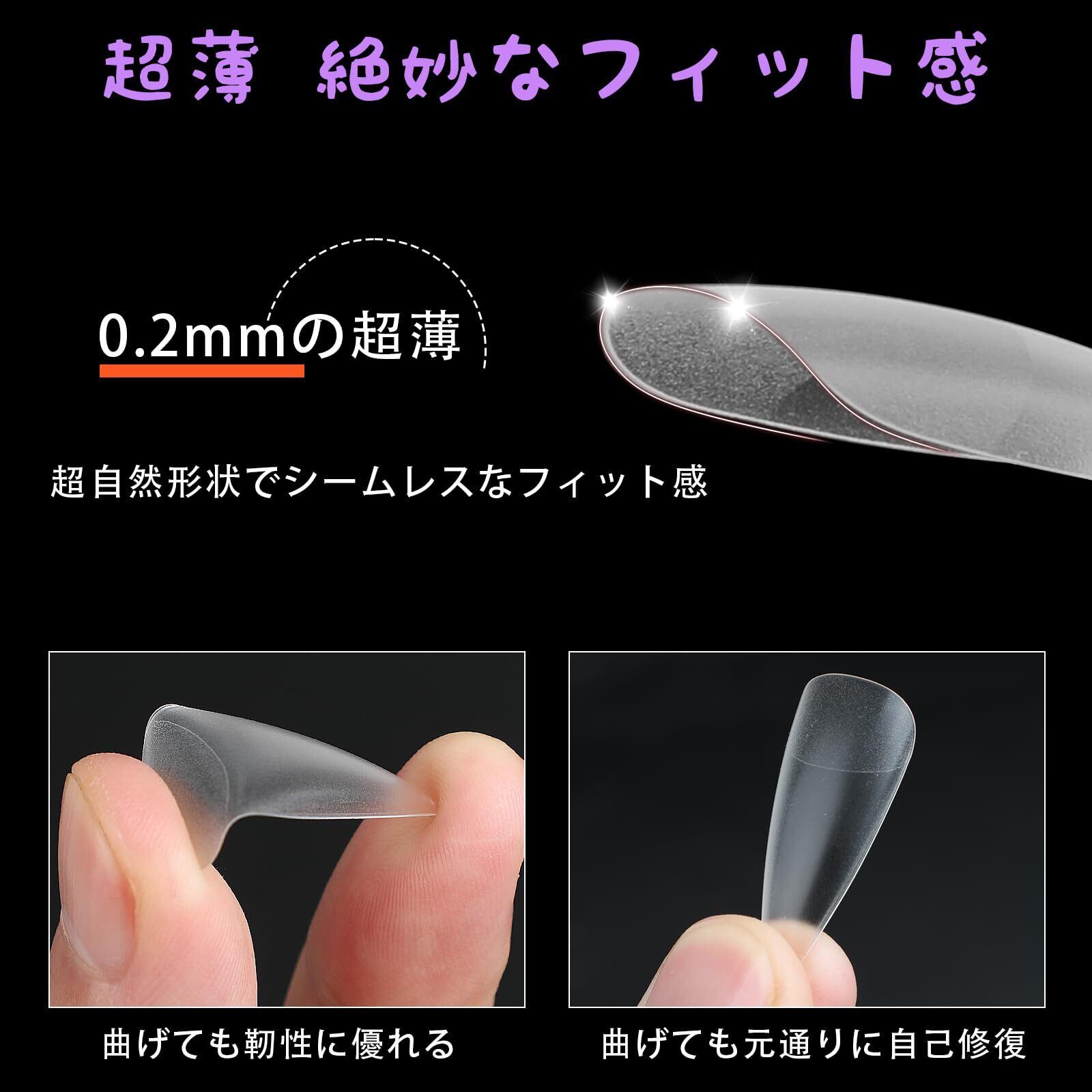 自然なフィット感:チップ自体が薄くて自爪並みに馴染みます。後端部は薄くで、前端部は厚いです。ネイルチップ全体が爪にフィットしやすくなり、不快感を感じなくなります。強化するとしっかり固定するのでかなり持ちもいいです。