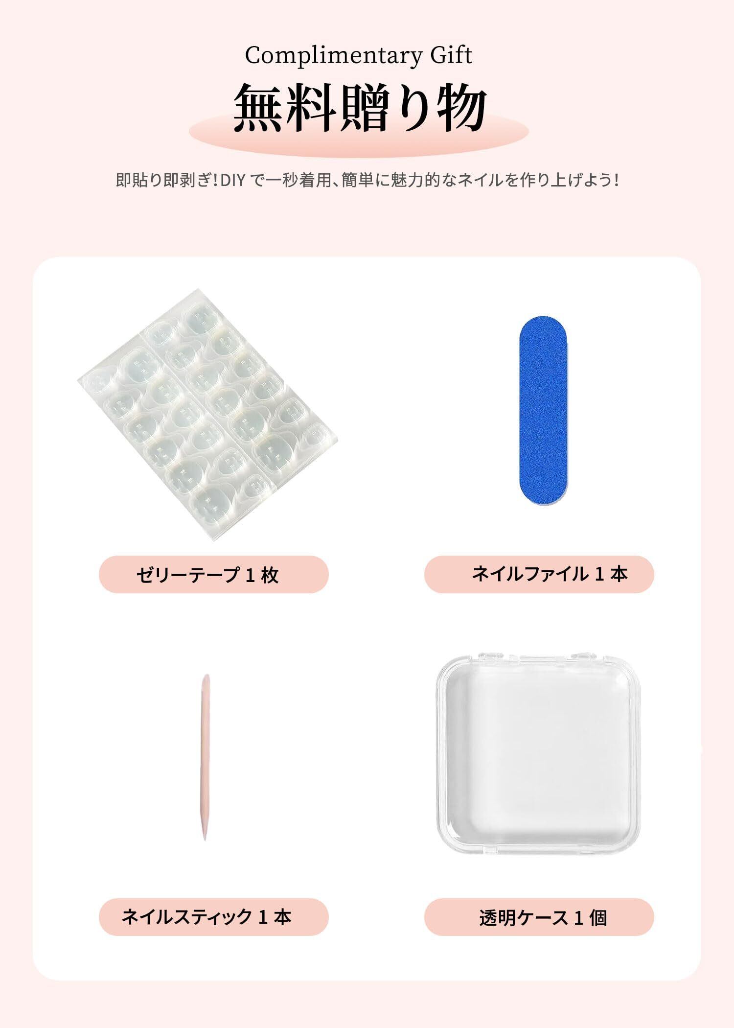 簡単で素早い取り付け方法:5〜10分で簡単に美しいネイルが完成!両面テープで素早く貼り付けられ、複雑な道具や技術は不要で、初心者や忙しいオフィスワーカーにも最適です。交換用テープも付属しており、繰り返し使用が可能です。