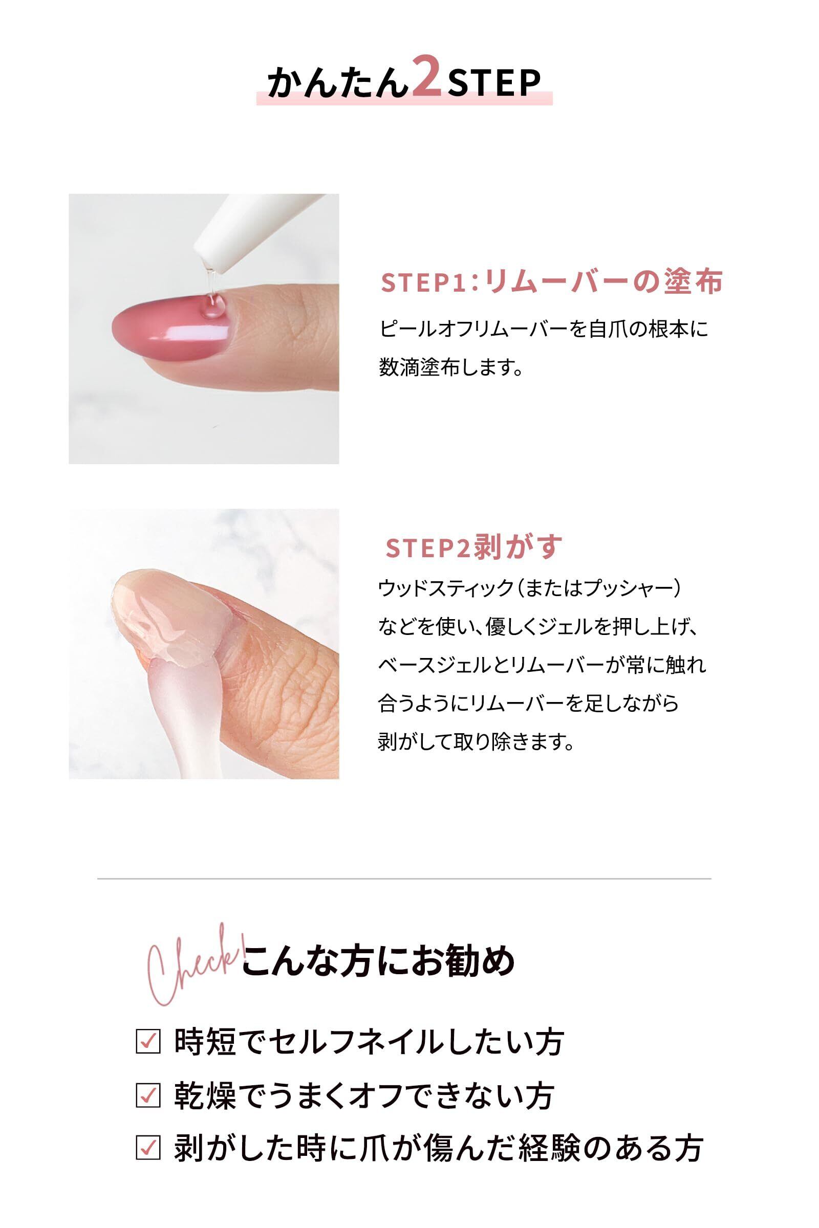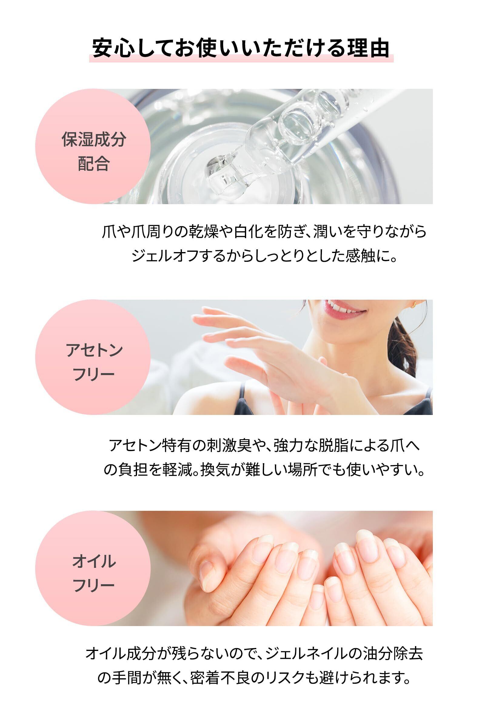 特徴 アセトンフリー・オイルフリー, ピールベース専用リムーバー, 保湿成分配合, 剥がしやすいから時短に, 安心の日本製
