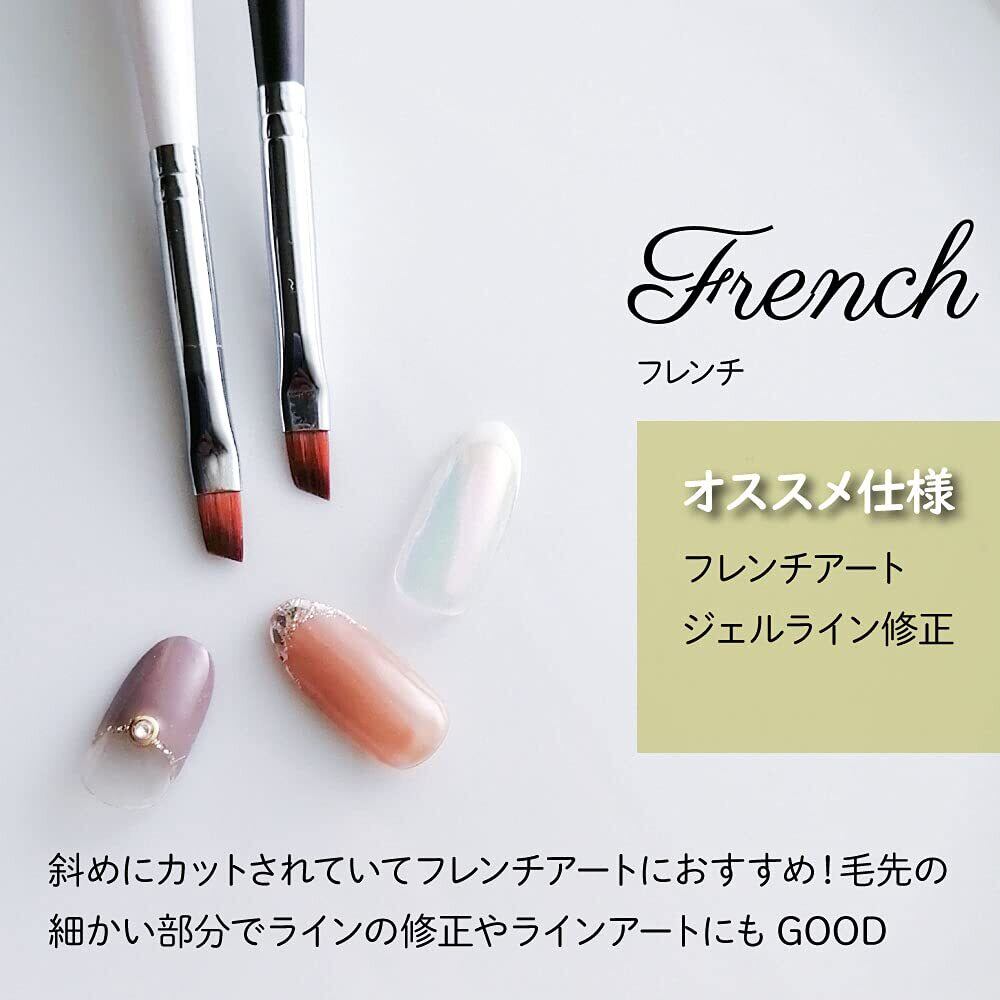 1.Oval オーバル穂先がカーブになっていてキューティクルラインにフィット!はみ出ることなくキレイに仕上がる。定番のオーバルブラシオススメ仕様 ベースジェル、カラージェル、トップコート 2.French フレンチ斜めにカットされていてフレンチアートにおすすめ!毛先の細かい部分でラインの修正やラインアートにも〇オススメ仕様 フレンチアート、ジェルライン修正