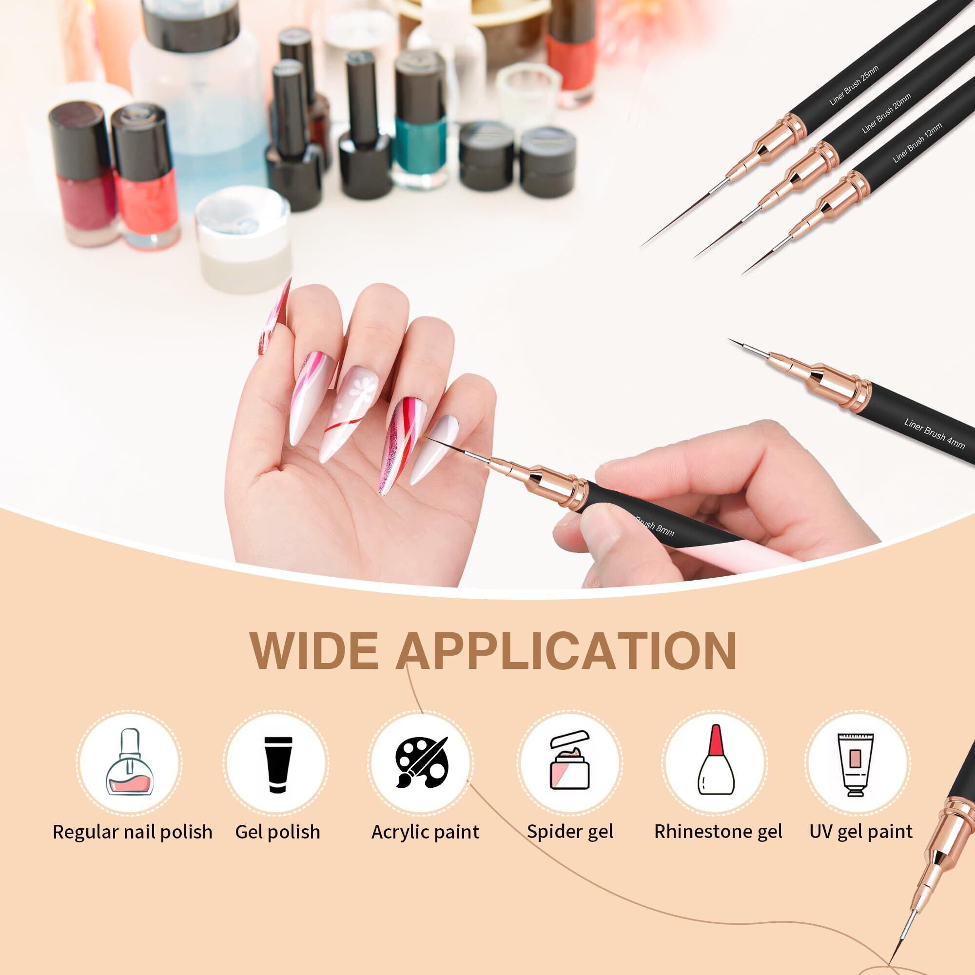 メタリックネイルアートブラシ ネイルアートライナーブラシ5本 ペインティングアートデザインブラシセット ネイルドット描画ツール 長いライン用 細いディテールに ファインドローイングサイズ 4/8/12/20/25mm ブラック